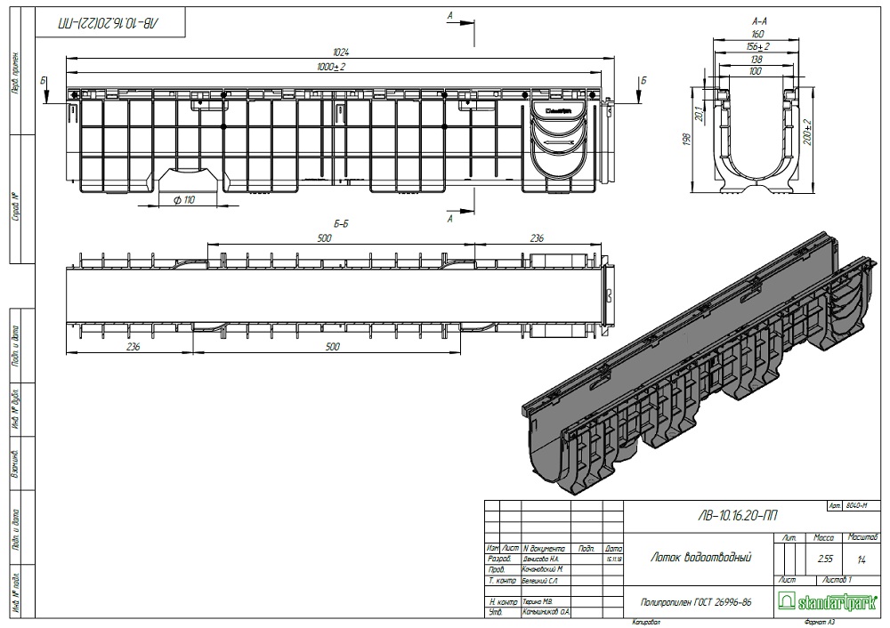 Лоток водоотводный пластиковый 1000 х 160 х 155 мм