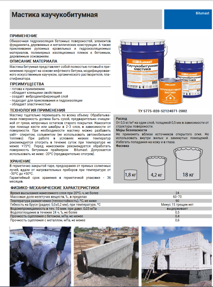 Каучукобитумная мастика применяется в качестве обмазочной гидроизоляции бетонных поверхностей, элементов фундамента, деревянных и металлических конструкции, а также для приклеивания рулонных кровельных и гидроизоляционных материалов, полимерных изоляционных пленок к бетонным и деревянным основаниям.