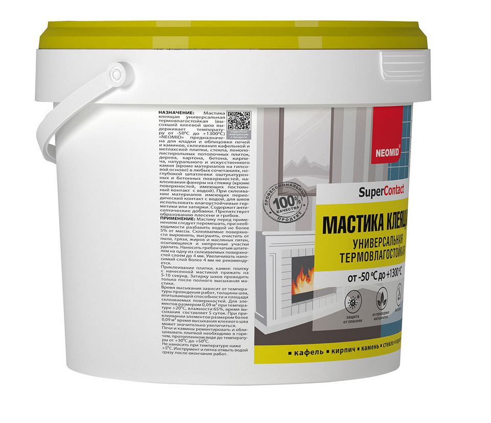 НАЗНАЧЕНИЕ: Мастика клеящая универсальная термовлагостойкая (высохший клеевой шов выдерживает температуру от -50°С до +1300°С) «NEOMID» предназначена для кладки и облицовки печей и каминов, склеивания кафельной и метлахской плитки, стекла, пенополистирольных потолочных плиток, дерева, картона, бетона, кирпича, натурального и искусственного камня (кроме материалов на гипсовой основе) в любых сочетаниях, неглубокой шпатлевки оштукатуренных и бетонных поверхностей, наклеивания фанеры на стяжку (кроме поверхностей, имеющих постоянный контакт с водой). При склеивании материалов имеющих периодический контакт с водой, для швов использовать влагоустойчивые герметики или затирки. Содержит антисептические добавки. Препятствует образованию плесени и грибов.