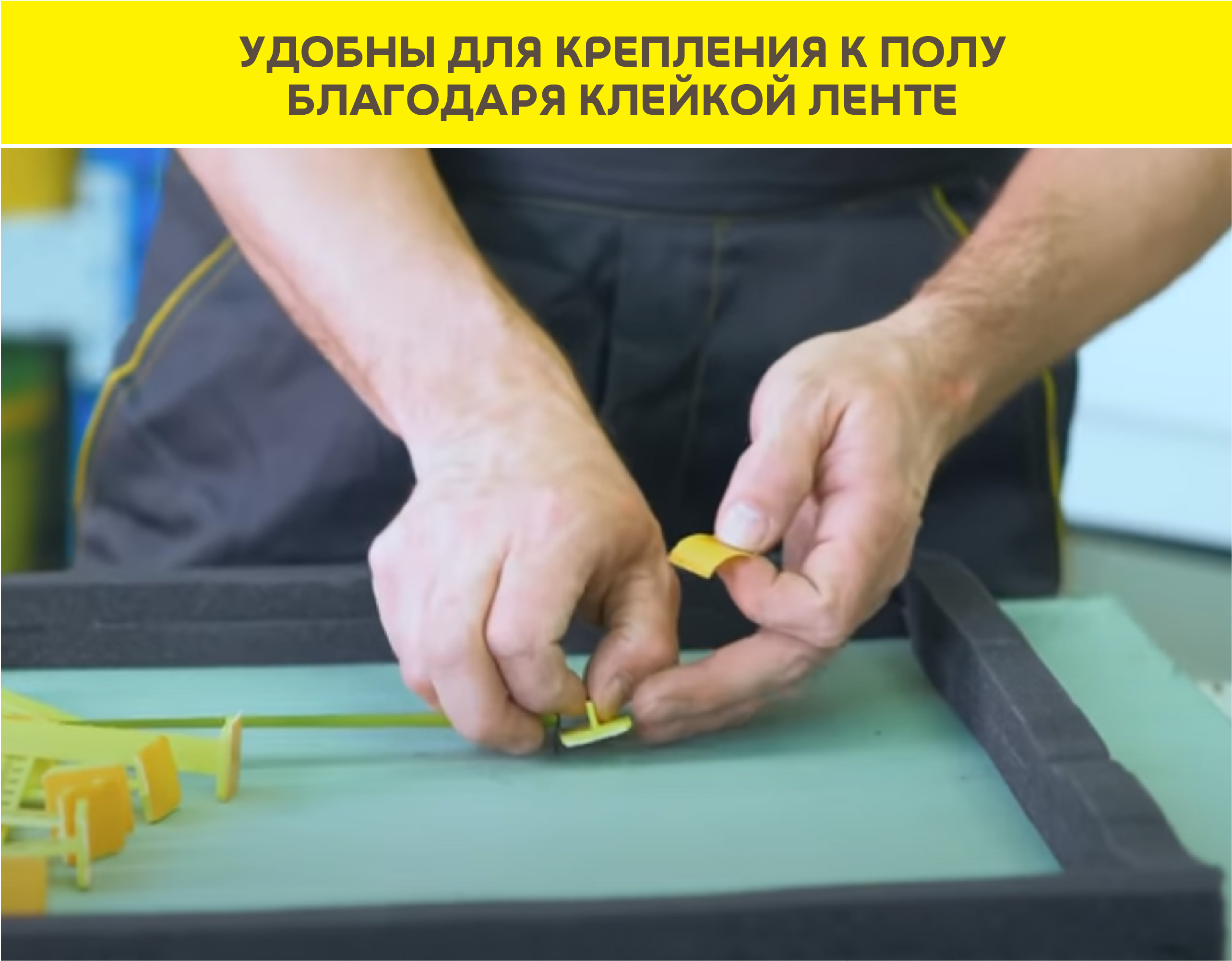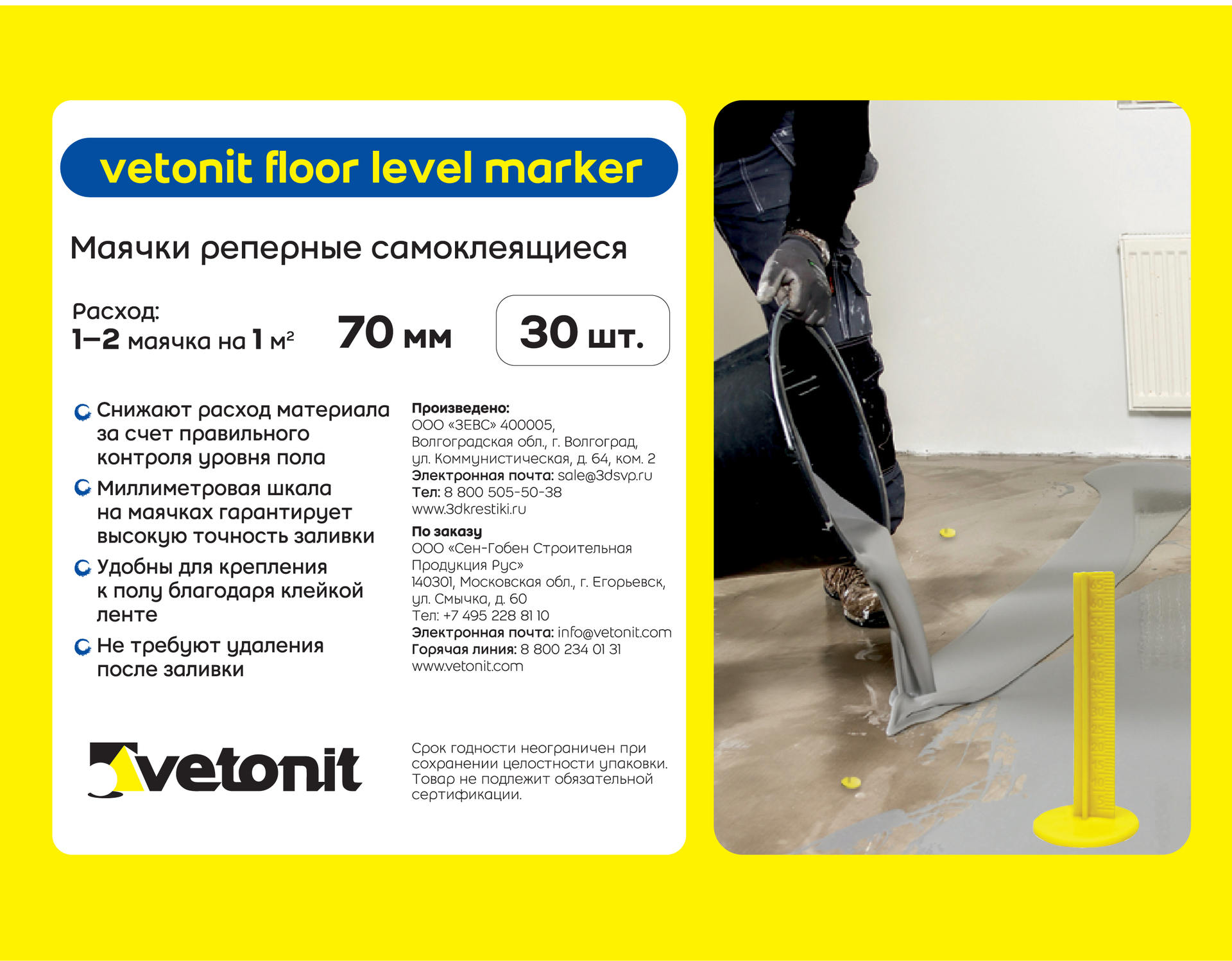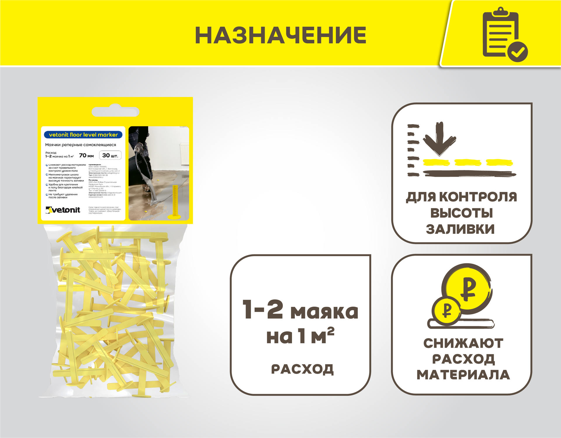 Мягкие реперные маячки с миллиметровой шкалой и клеевым слоем для крепления к полу. Для контроля толщины заливки наливных полов weber.vetonit fast 4000, fast level, 4100, 4350, strong, 3100 (для слоя от 10 мм) Фасовка: пакеты по 30 штук. Цвет -желтый Основа -мягкий пластик Высота маячка 70мм.Характеристики