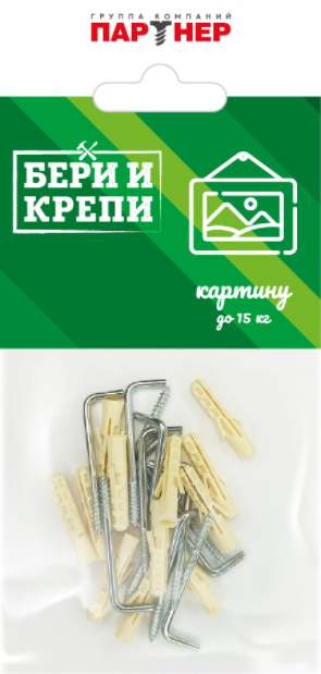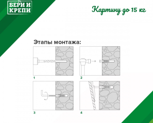 Набор для крепления картин включает в себя крепеж, который подойдет для полотен весом до 15 кг. Он позволит быстро и качественно зафиксировать картину на поверхности.