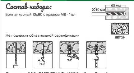 Болт анкерный 10х60 с крюком М8 - 1 шт