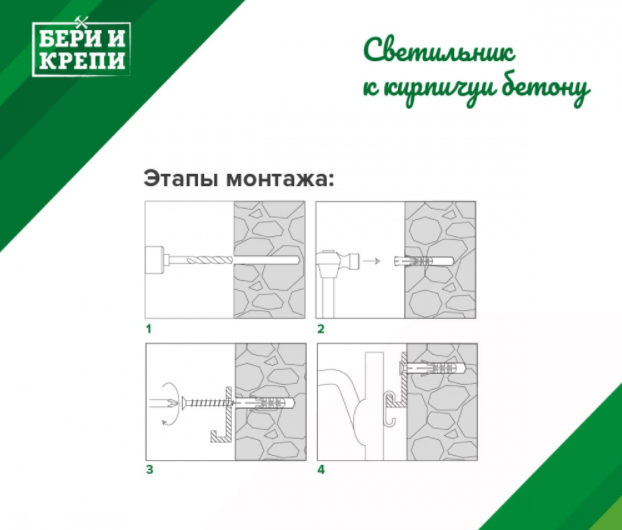 Набор для крепления светильника к кирпичу или бетону. Теперь вам не придется искать то, что нужно для крепления в разных отделах магазина. С использованием нашего набора монтаж будет произведен быстро и качественно.