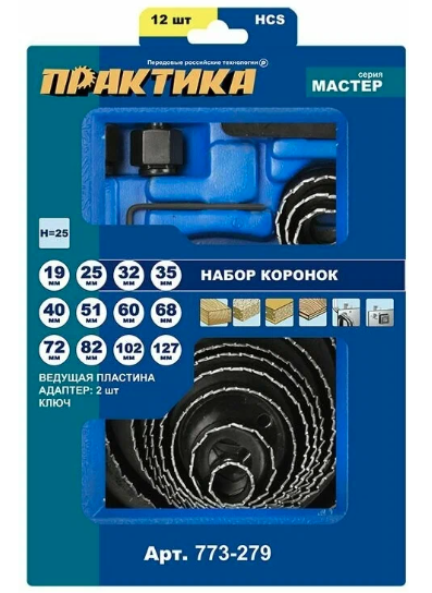 Набор HCS коронок ПРАКТИКА 773-279 состоит из 12 предметов и 2 адаптеров. Упаковка - пластиковый бокс. Коронки подходят для работы как с мягкими материалами (пластик, ДСП, гипсокартон), так и с твердыми (древесина твердых пород).