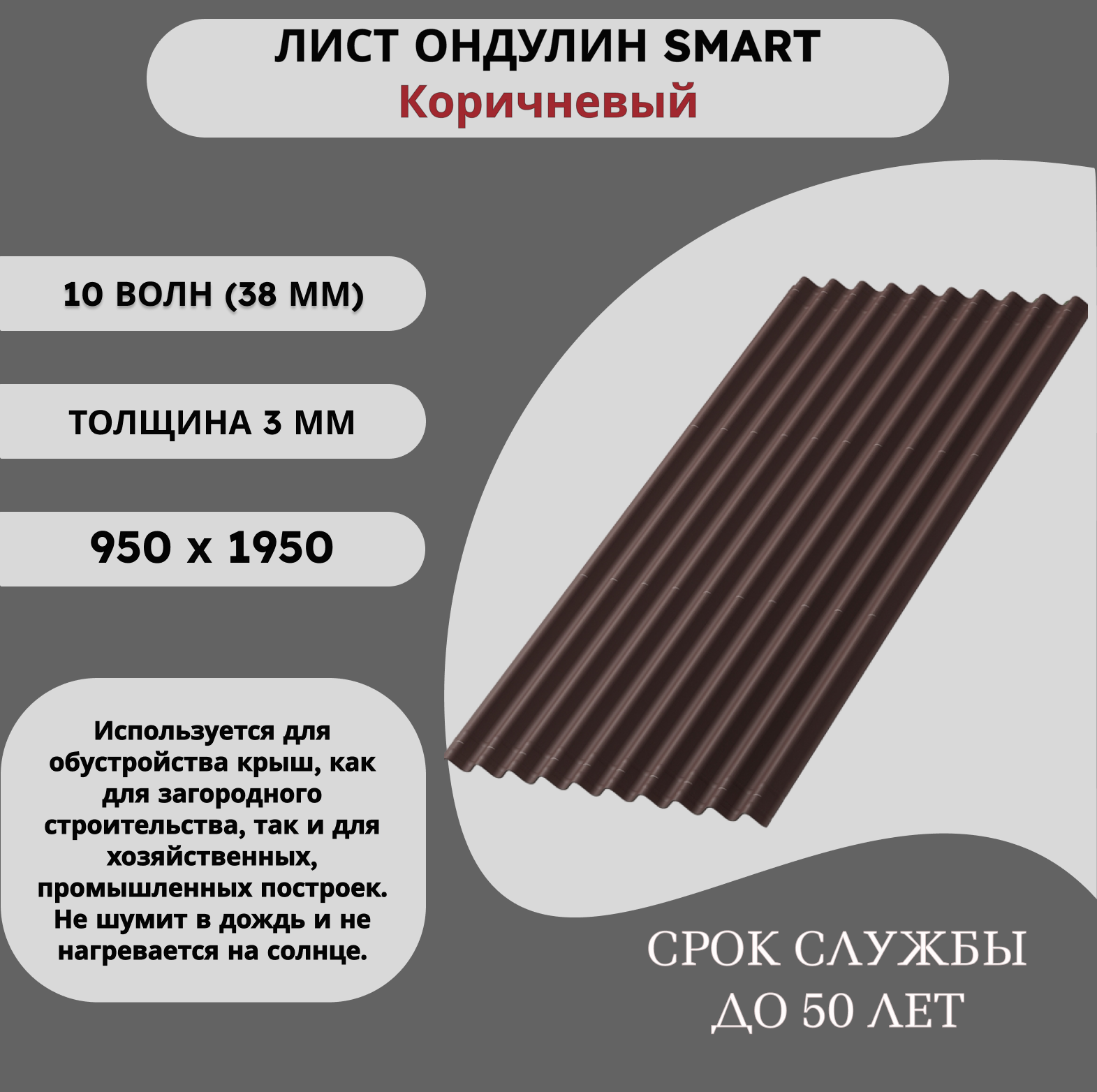 - Долговечность: Забудьте о ржавчине, конденсате и постоянных ремонтах! Ондулин устойчив к атмосферным воздействиям и прослужит вам до 50 лет.