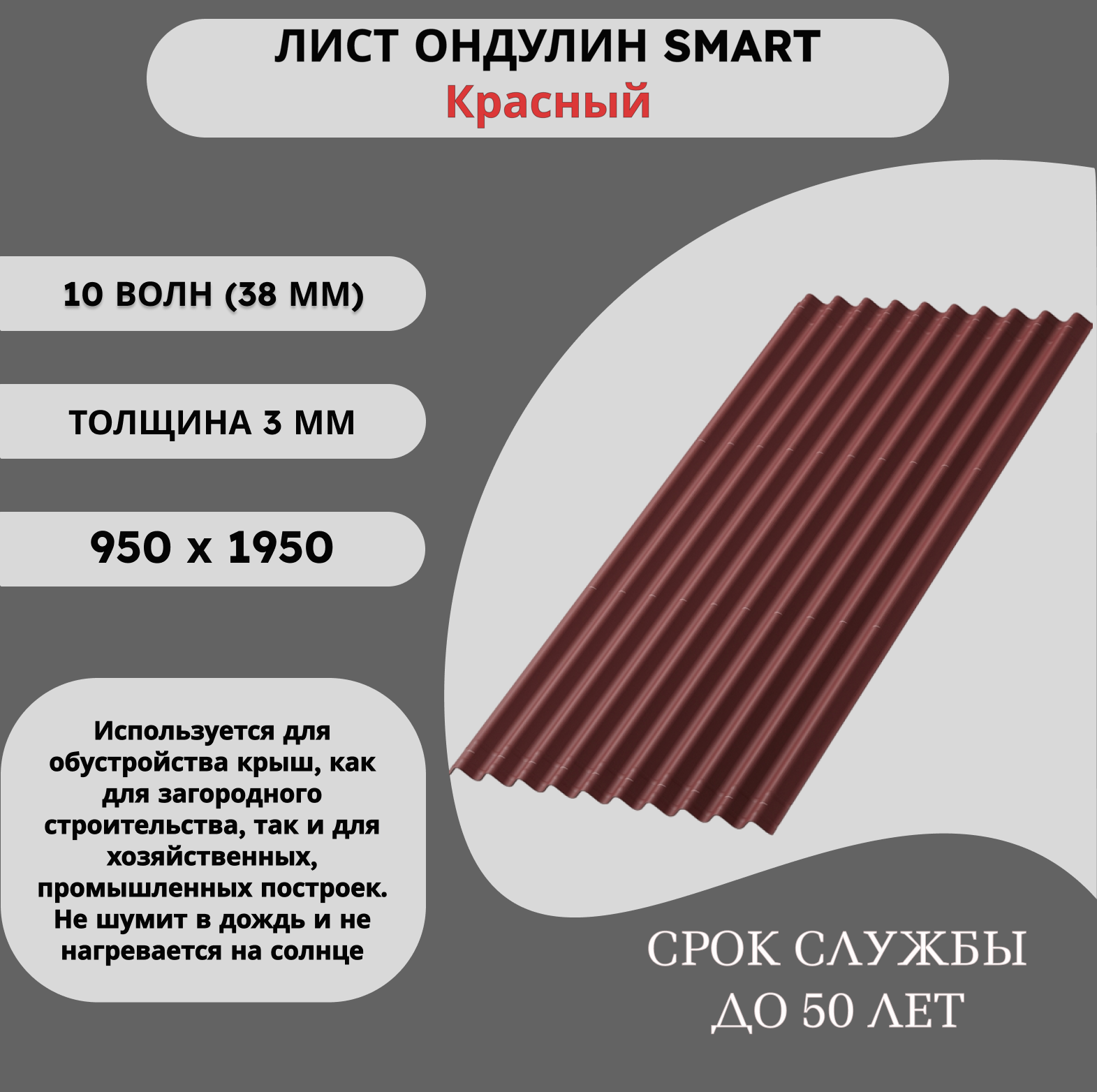 Ондулин Смарт красный – кровельное покрытие, которое представляет собой битумные волнистые листы. Используется для обустройства крыш, как для загородного строительства, так и для хозяйственных, промышленных построек.