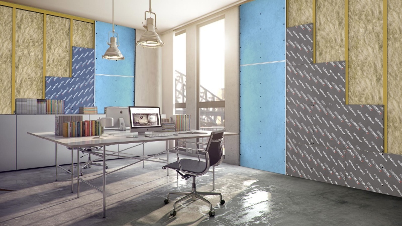 В состав панели входит армированный гипсокартонный лист повышенной плотности и упругая эластичная мембрана. Комбинация слоев продумана таким образом, что панель самостоятельно изолирует шум и улучшает звукоизолирующие свойства других материалов, с которыми сопрягается.