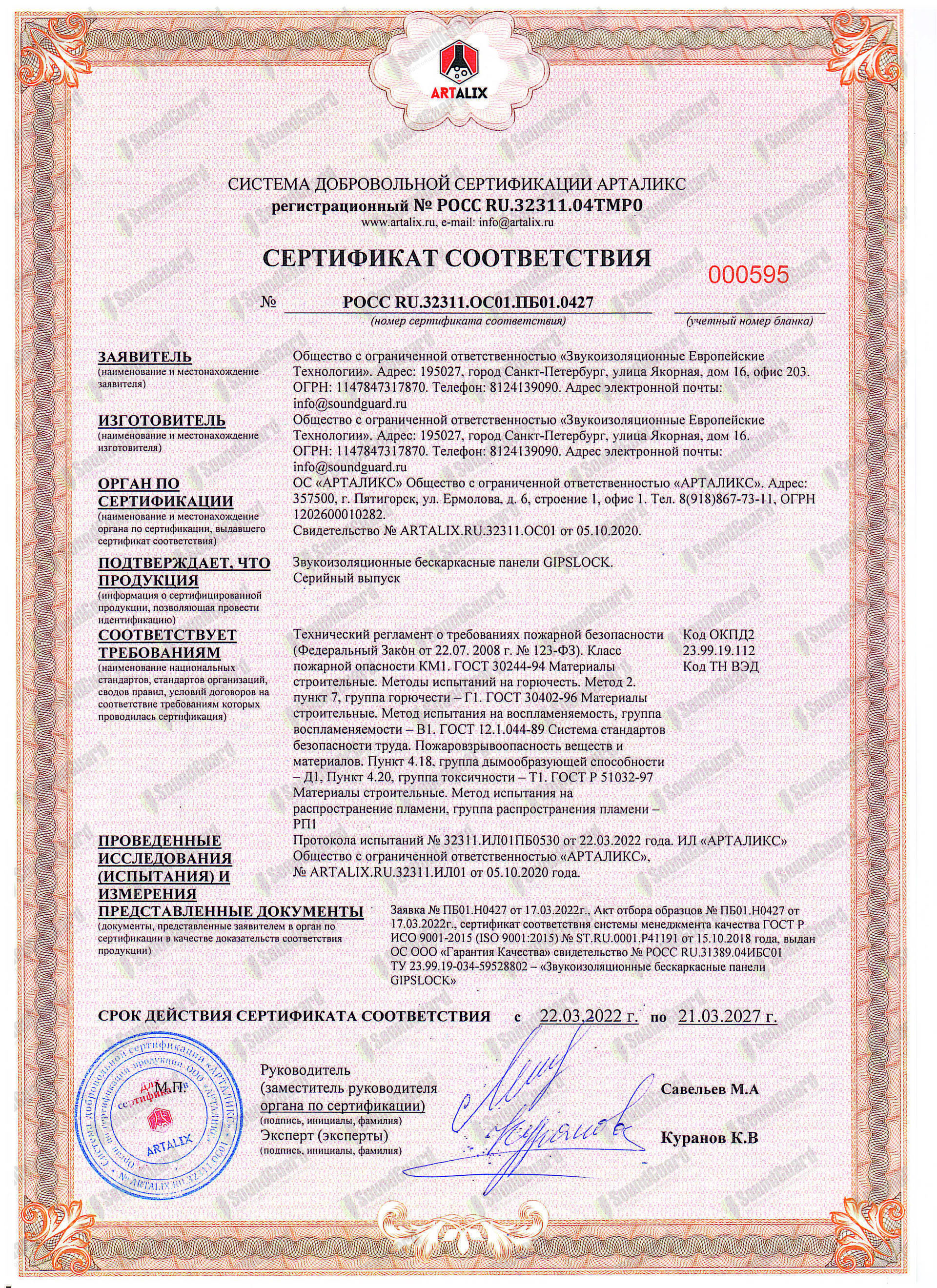 Панель звукоизоляционная трехслойная SoundGuard Gipslock 40 1200 х 600 х 40 мм