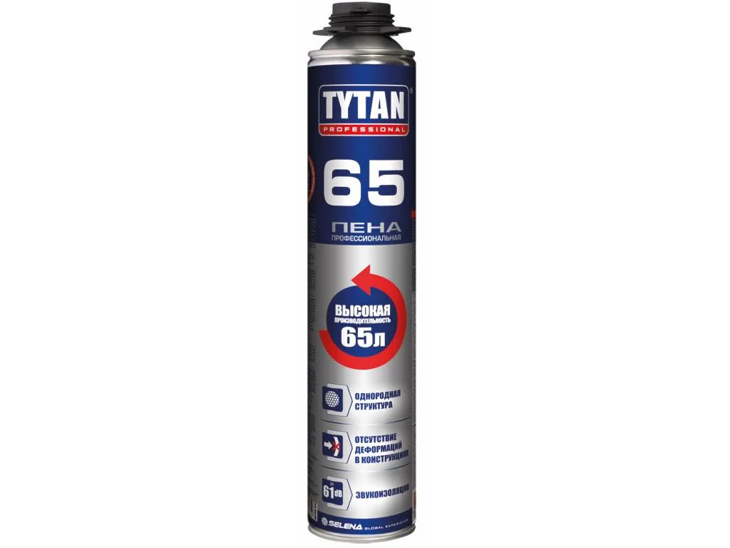 Пена профессиональная TYTAN 65 - готовая к применению однокомпонентная полиуретановая пена, застывающая под воздействием влаги воздуха, специально рекомендована для широкого спектра применений в области профессионального монтажа, герметизации и изоляции в строительстве. Изготовленная по инновационной рецептуре, пена быстро застывает и имеет однородную мелкоячеистую структуру на срезе.