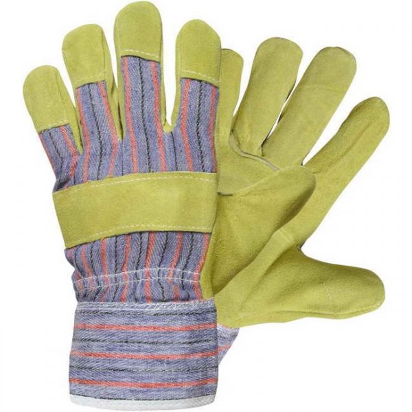 Перчатки спилковые комбинированные - экономичные перчатки, комбинированные х/б ткань со спилком, крага - х/б. Спилок КРС, сорт В, 1,0 +/- 0,2 мм, желтого цвета. Применяются для защиты рук от истирания.