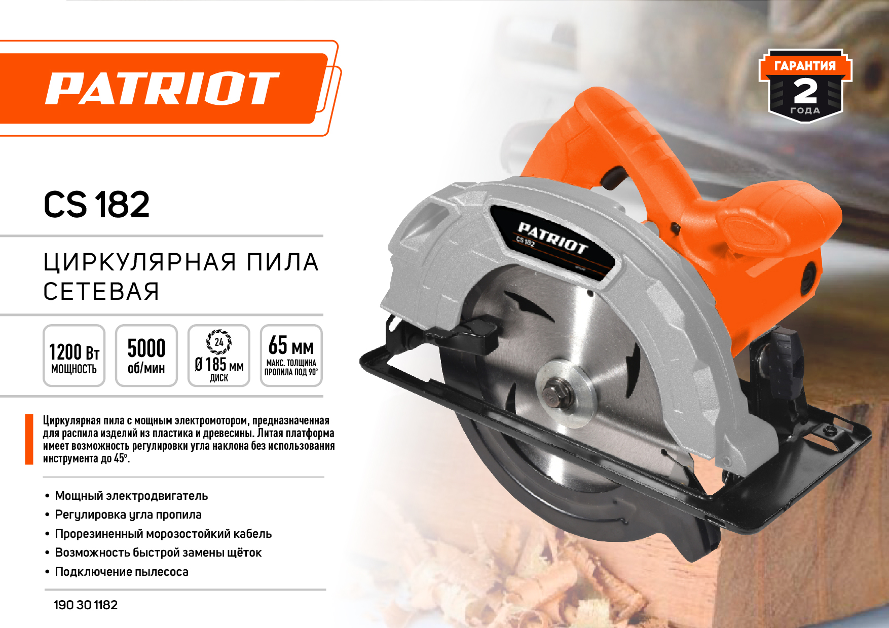 Пила дисковая PATRIOT 1200Вт 185мм CS 182 190301182 - компактный инструмент, предназначенный для распила: дерева, фанеры, ДВП, ДСП и пластмассы. Данная модель предназначена для широкого круга пользователей, в том числе для тех, кто обладает только базовыми навыками и малым опытом пользования. Имеет литое основание. Оснащена мощным двигателем на 1200 Вт. На данную модель подходят диски диаметром 185 мм, с посадочным диаметром 20 мм. Преимущества: • Легкость ремонта инструмента – есть возможность быстрой замены угольных щеток; • Простота работы - есть настройка регулировка угла пропила (от 45 до 90 градусов) без использования дополнительного инструмента, а также возможность использования направляющей шины; • Возможность работ на улице – модель оснащена прорезиненным морозоустойчивым кабелем длиной в 2 метра; Глубина пропила при 90 градусов – 65 мм Комплектация: