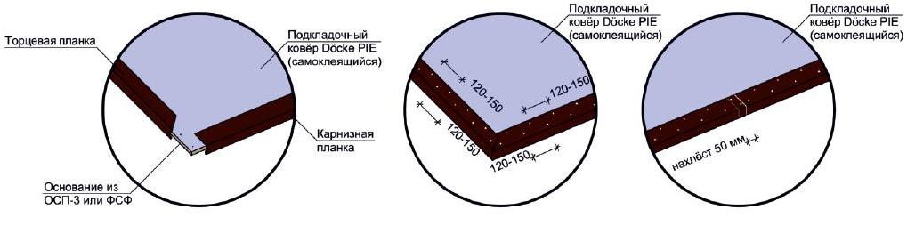 - карнизные планки необходимо устанавливать после монтажа кронштейнов под водосточную систему непосредственно на подкладочный ковер с нахлестом друг на друга не менее 50мм