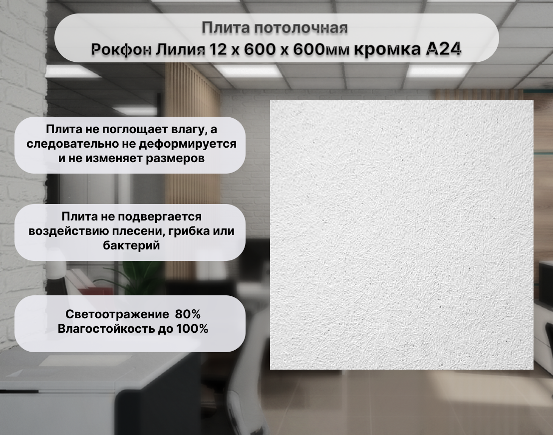 Rockfon Lilia - это плита с гладкой поверхностью белого цвета,без использования стеклоткани на задней поверхности панели.