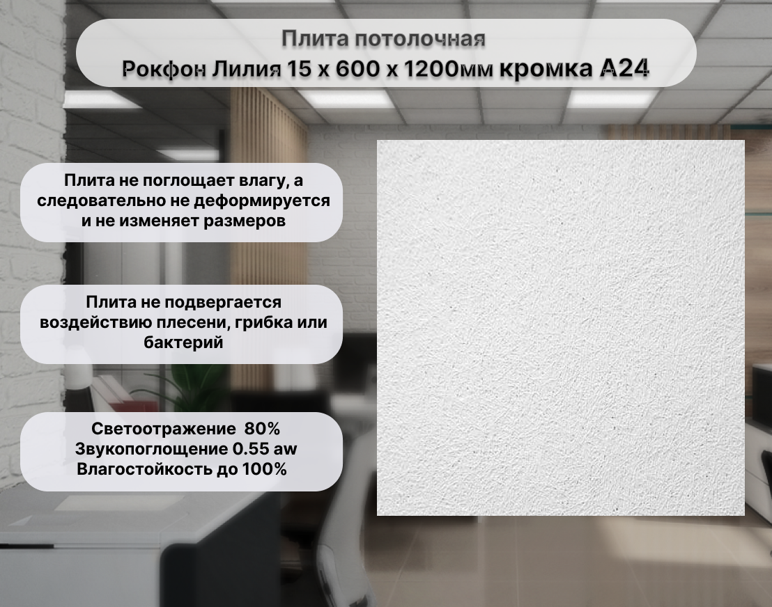 Распродажа! Rockfon Lilia - это плита с гладкой поверхностью белого цвета,без использования стеклоткани на задней поверхности панели. Подвесной потолок Лилия обладает рядом преимуществ: