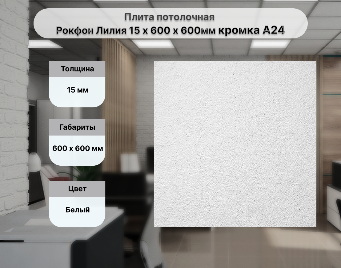 Rockfon Lilia - это плита с гладкой поверхностью белого цвета, без использования стеклоткани на задней поверхности панели.