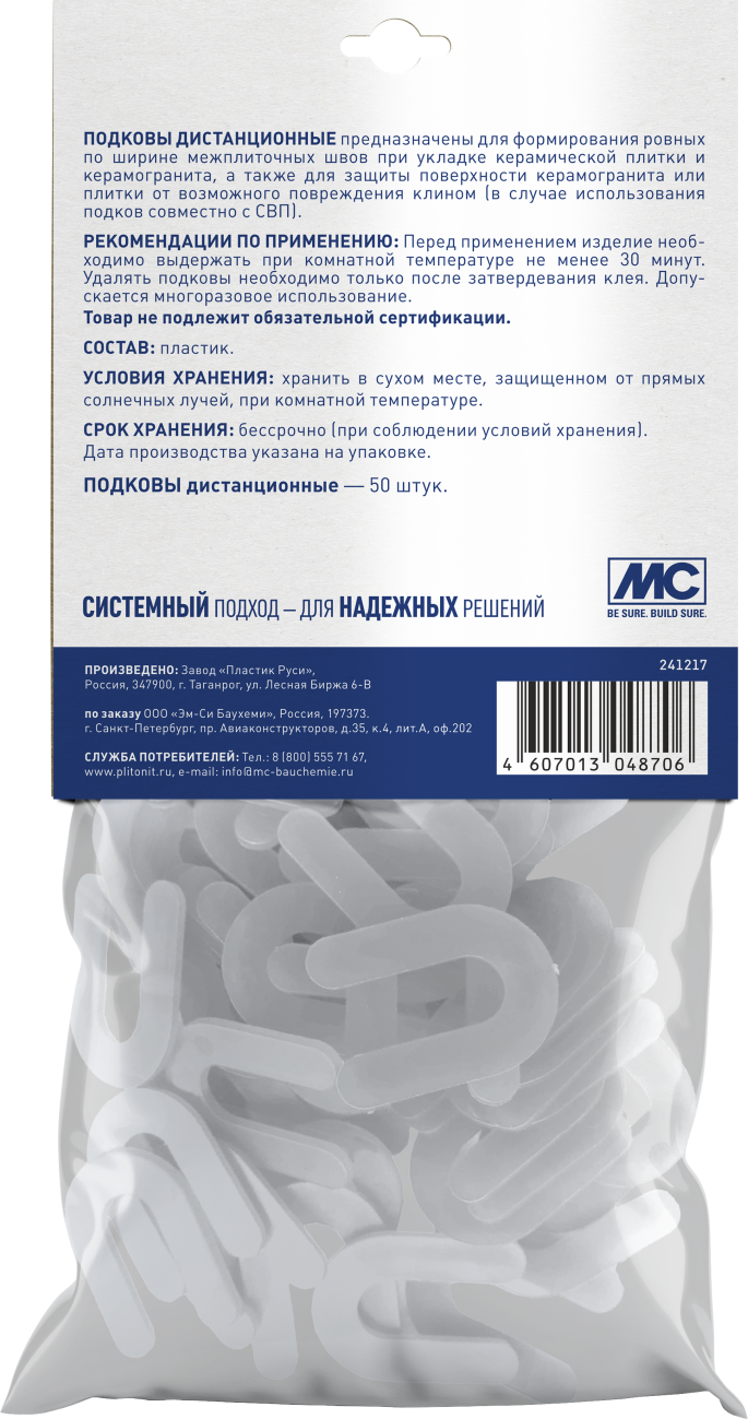 Подковы дистанционные — это часть системы выравнивания плитки (СВП), служащая для формирования межплиточных швов нужной ширины. Они также применяются как подложка под клин, чтобы защитить хрупкое плиточное покрытие от повреждений. Подходят для плитки толщиной от 3 до 12 мм.
