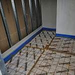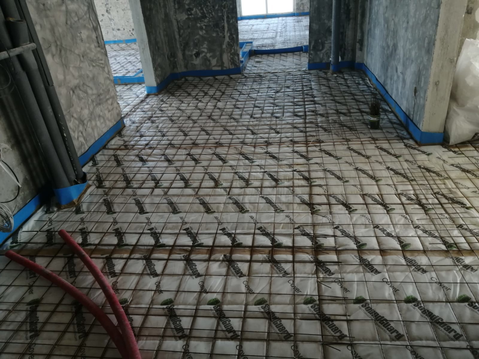 Рулоны раскатывают горизонтально рулон к рулону стык в стык, с заведением на стену на высоту будущей стяжки, места стыка проклеиваются «армированным скотчем».