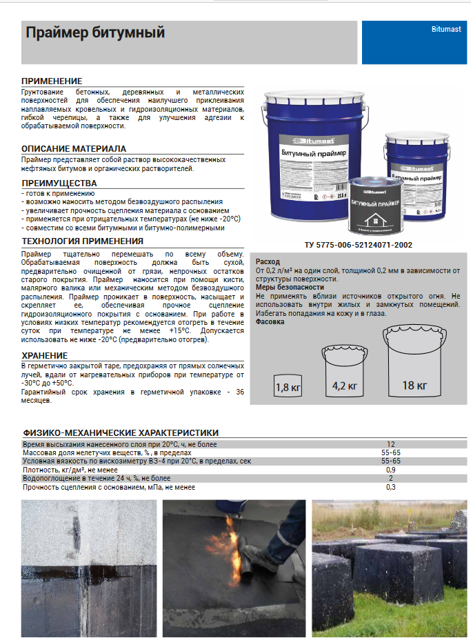 Праймер обеспыливает и укрепляет поверхность, обеспечивая прочное сцепление основания с гидроизоляционными материалами. При работе в условиях низких температур рекомендуется отогреть в течение суток при температуре не менее +15?С. Допускается использовать не ниже -20?С (предварительно отогрев).