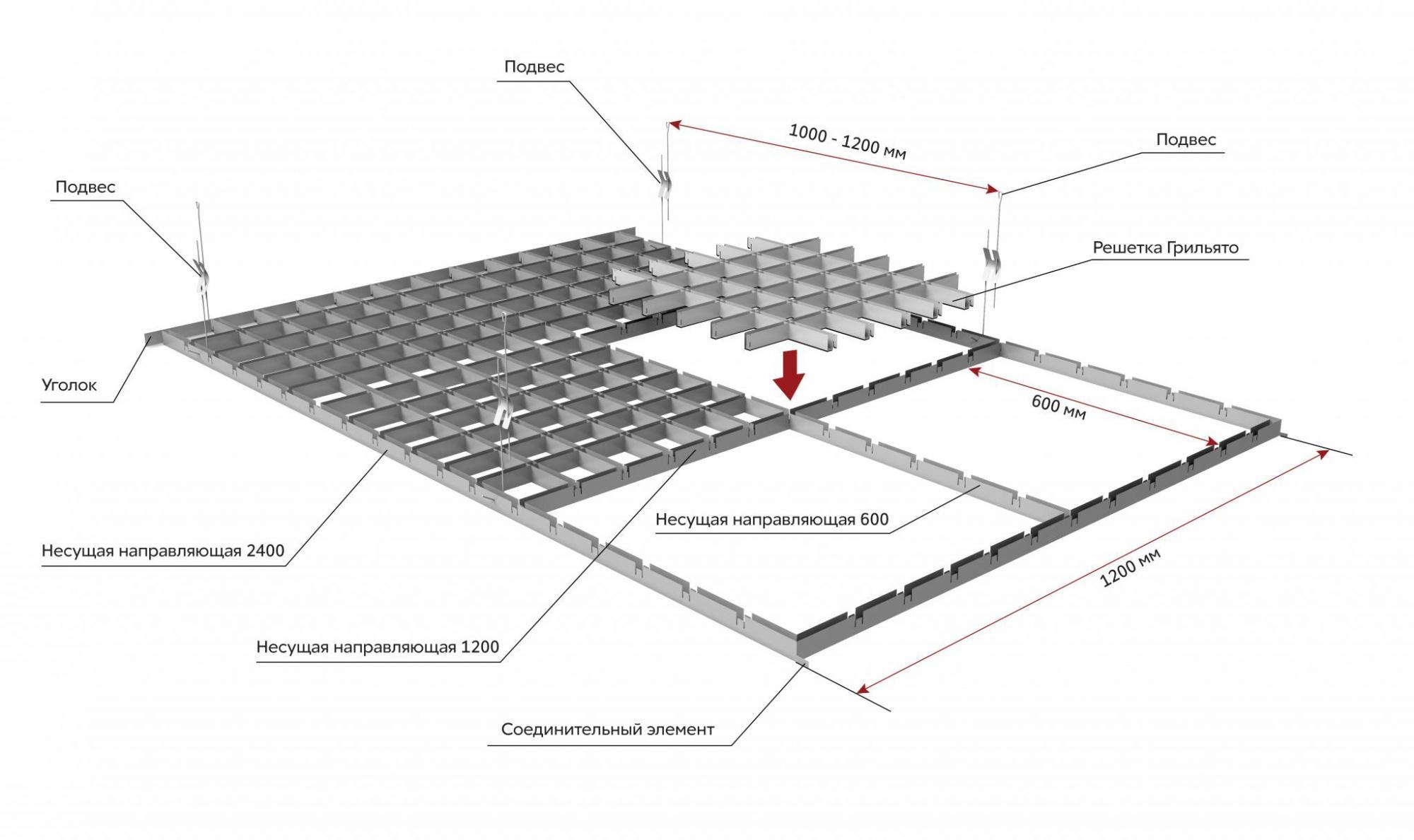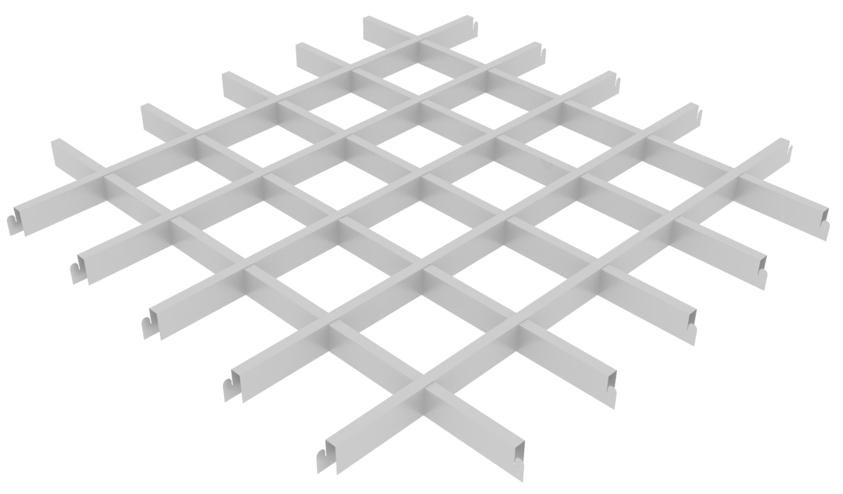 Потолок «Грильято» представляет собой объемную решётку, образованную U-образными алюминиевыми профилями, шириной 10мм и высотой 40мм.