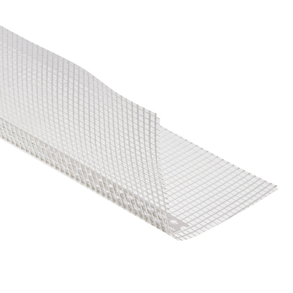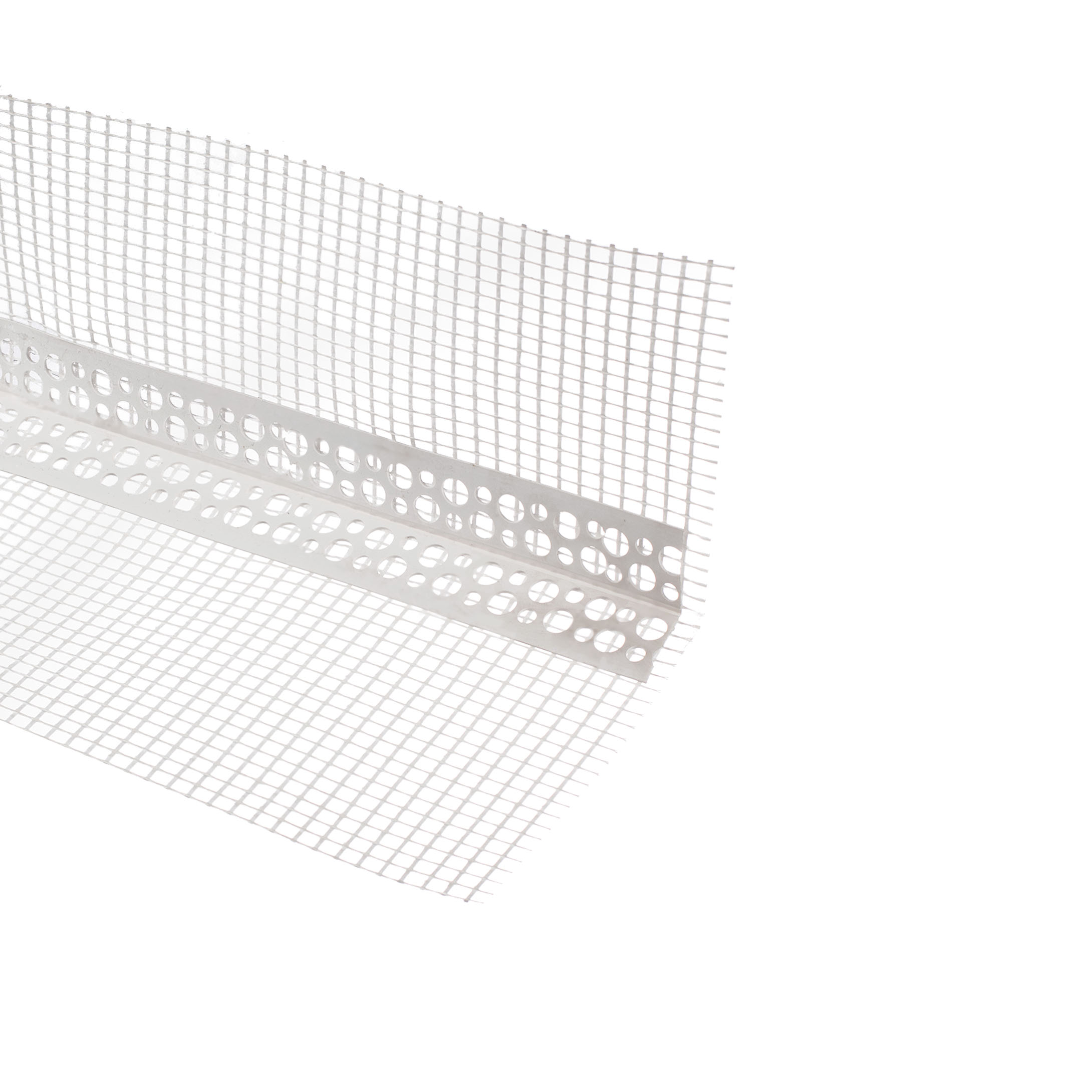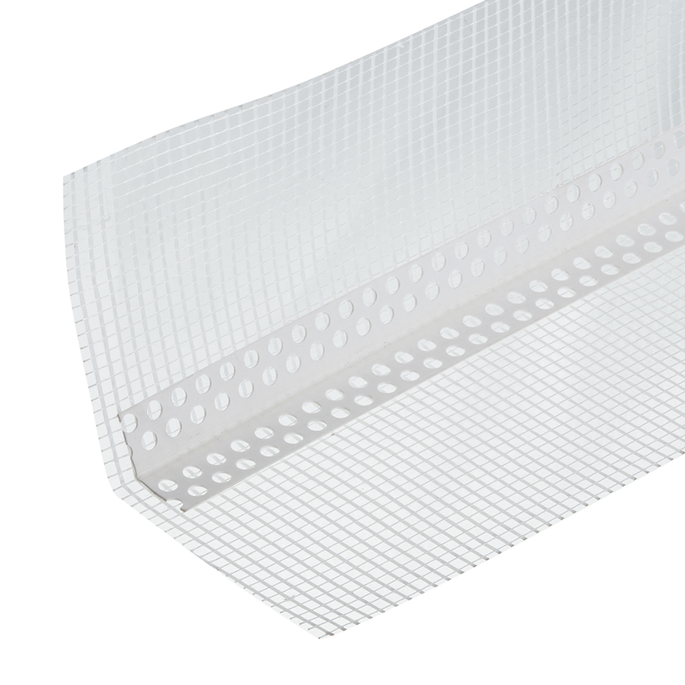 Изготовлен из ПВХ и имеет перфорацию по всей длине. К профилю приклеена щелочестойкая сетка размером 10х10см для большего сцепления со стеной и улучшения качества штукатурных работ.