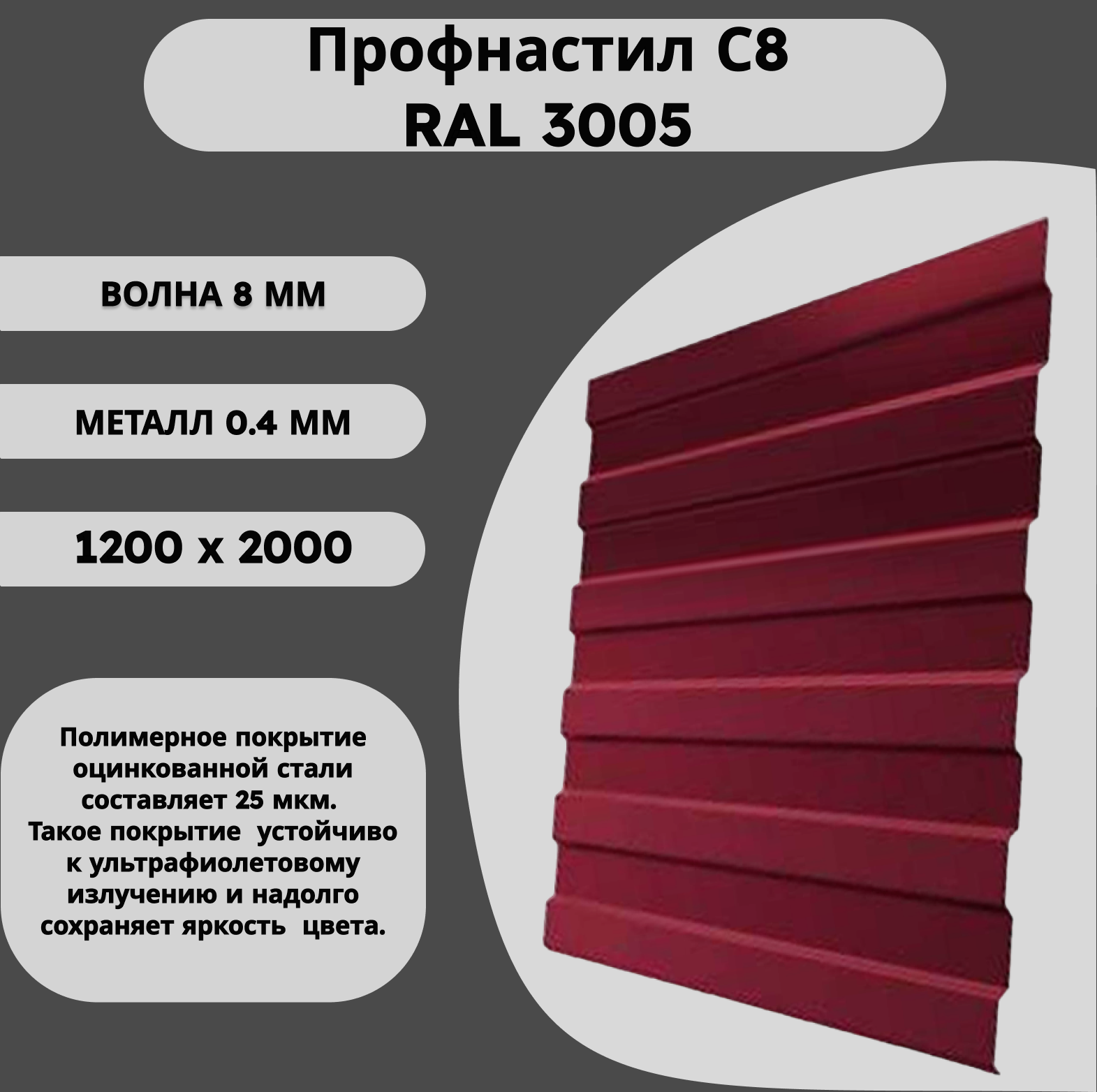 Профнастил С8 RAL 3005 красное вино 0,4 х 1200 х 2000мм