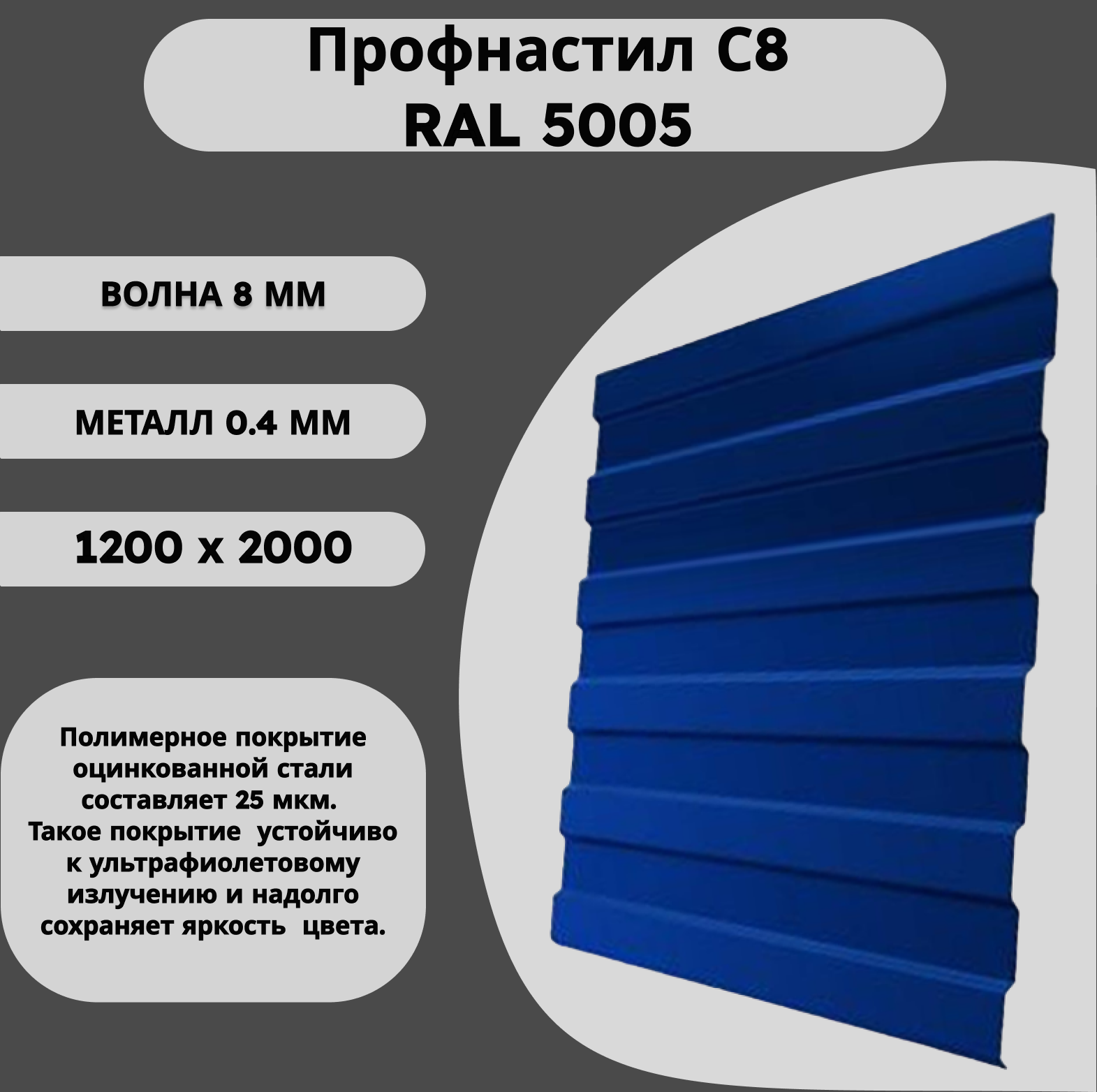 Профнастил С8 RAL 5005 синий 0,4 х 1200 х 2000мм