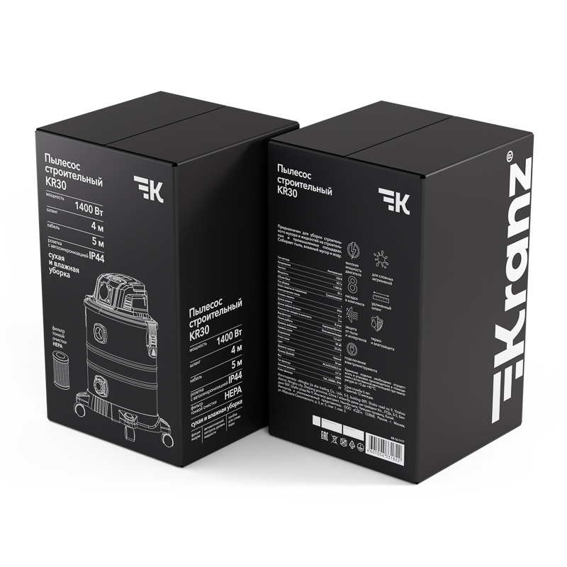 Мощный строительный пылесос KRANZ KR30 (1400Вт, 30л, шланг 4м) идеально справляется с пылью, мусором, водой и строительным хламом на объектах, в мастерских и гаражах.