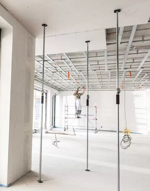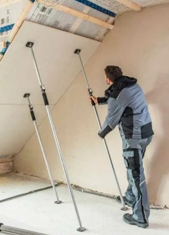 Инструмент сверху и снизу имеет пятки-опоры, которые служат для поддерживания листов ГКЛ, а также снабжено резьбовым механизмом распора.