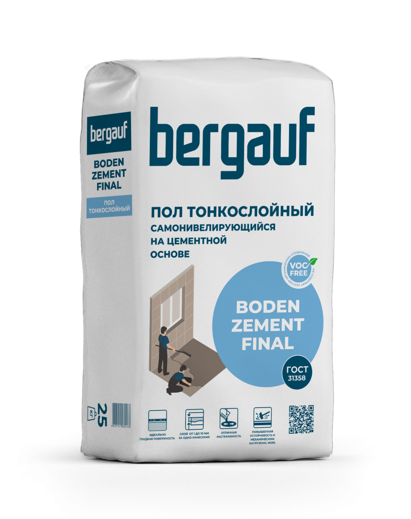 Самовыравнивающийся, быстротвердеющий цементный пол Бергауф BODEN ZEMENT FINAL, используя его Вы гарантированно получите глянцевую, ровную и сверхпрочную поверхность после одного нанесения. Возможно как машинное так и ручное нанесение.