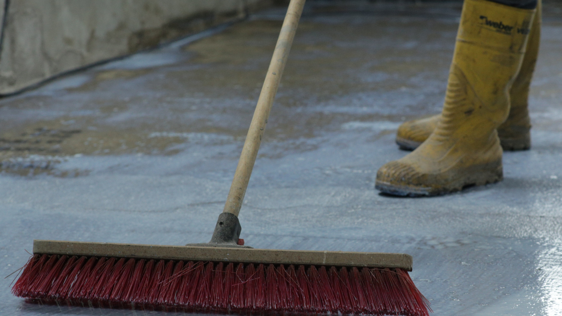 Основание должно быть прочным (бетон марки не менее В15, цементная стяжка не менее 15 МПа), твердым и очищенным от пыли, грязи, остатков старых красок, масляных пятен и незакрепленных частиц. Все локальные дефекты должны быть предварительно заполнены этим же раствором. Существующая стяжка или бетонная подготовка простукивается, слабые места удаляются. Если повреждено более 30% - старая стяжка удаляется полностью.