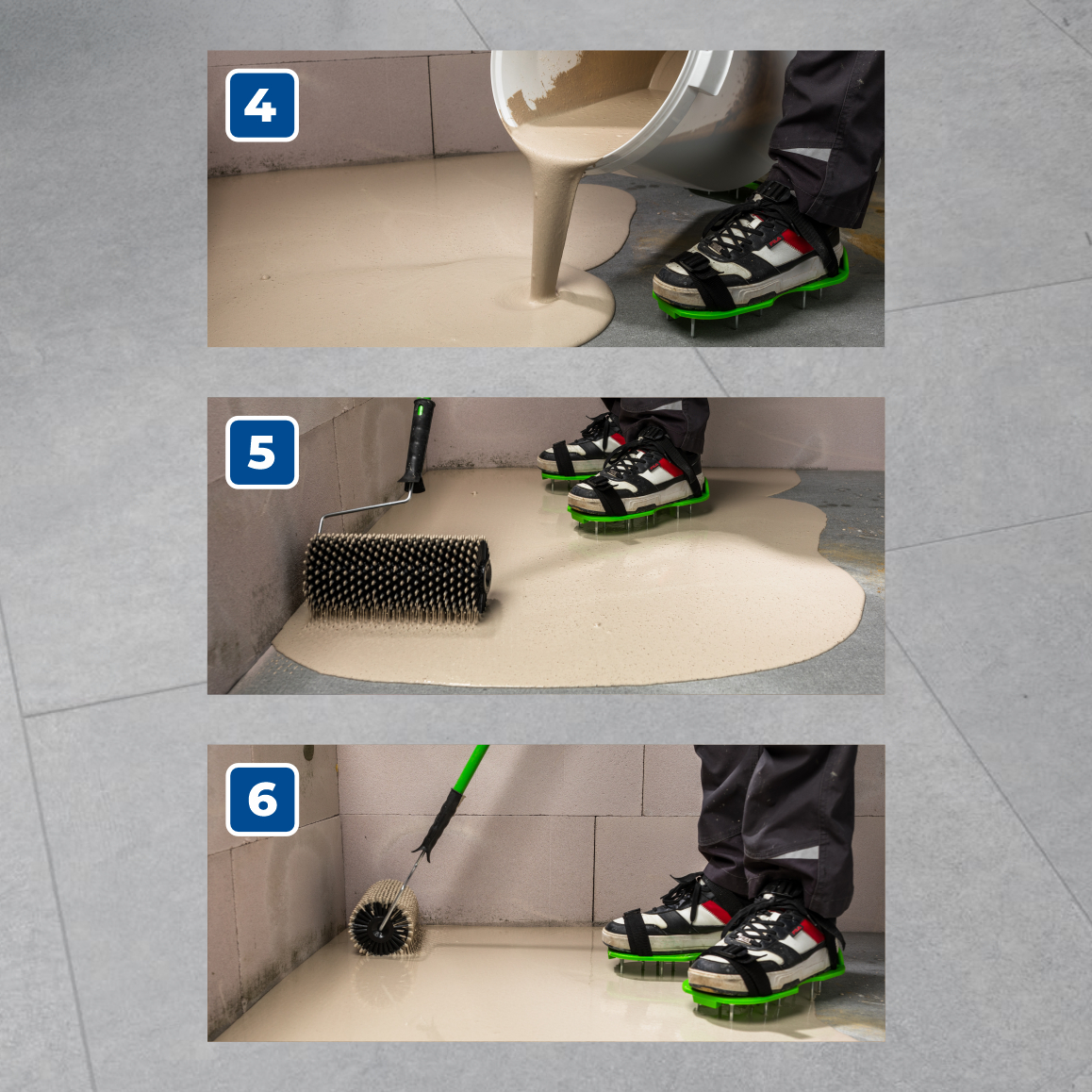 При использовании в санузлах и ванных комнатах необходима обработка поверхности гидроизоляционной мастикой PLITONIT ГидроЭласт. Керамическую плитку можно укладывать через 3 дня, предварительно прогрунтовав поверхность пола полимерными грунтовками PLITONIT. Пластиковые покрытия и ламинат можно укладывать примерно через 7 дней, предварительно сравнив влажность основания с величиной, допускаемой инструкцией производителя напольного покрытия. Указанные