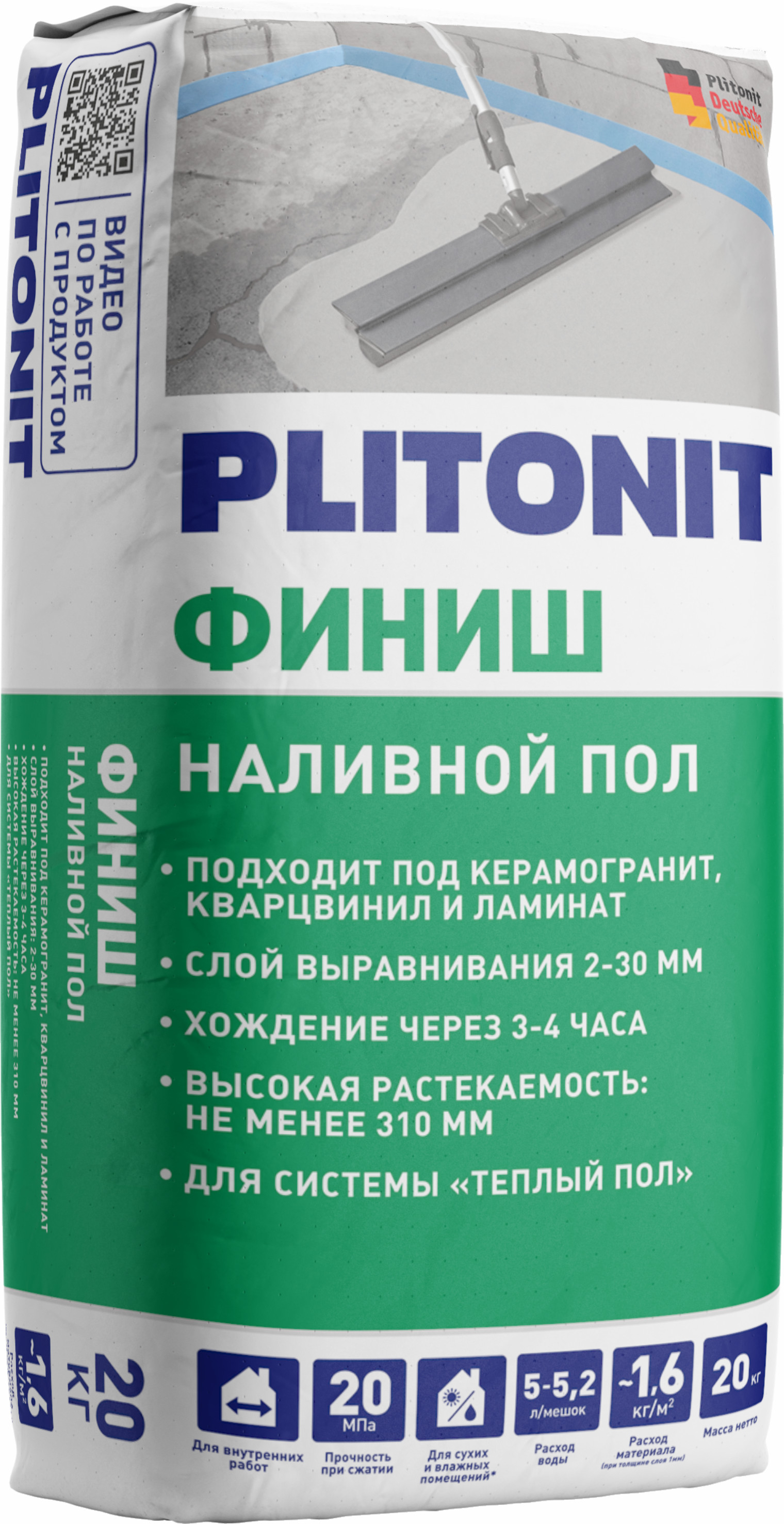 Ровнитель Плитонит Финиш быстротвердеющий 20кг - быстротвердеющий самовыравнивающийсяфинишный ровнитель с повышенной растекаемостью. Предназначен для выравнивания и корректирования бетонных полов и монолитных цементных стяжек, внутри жилых и офисных помещений. Используется под укладку плитки, выстилающих покрытий, ламината и стяжки для теплого пола. Применяется при строительстве и ремонте жилых и общественных зданий и сооружений, в том числе учебно-воспитательных заведениях, детских, дошкольных, школьных и медицинских учреждениях (в т.ч. лечебно-профилактических и санаторно-курортных).