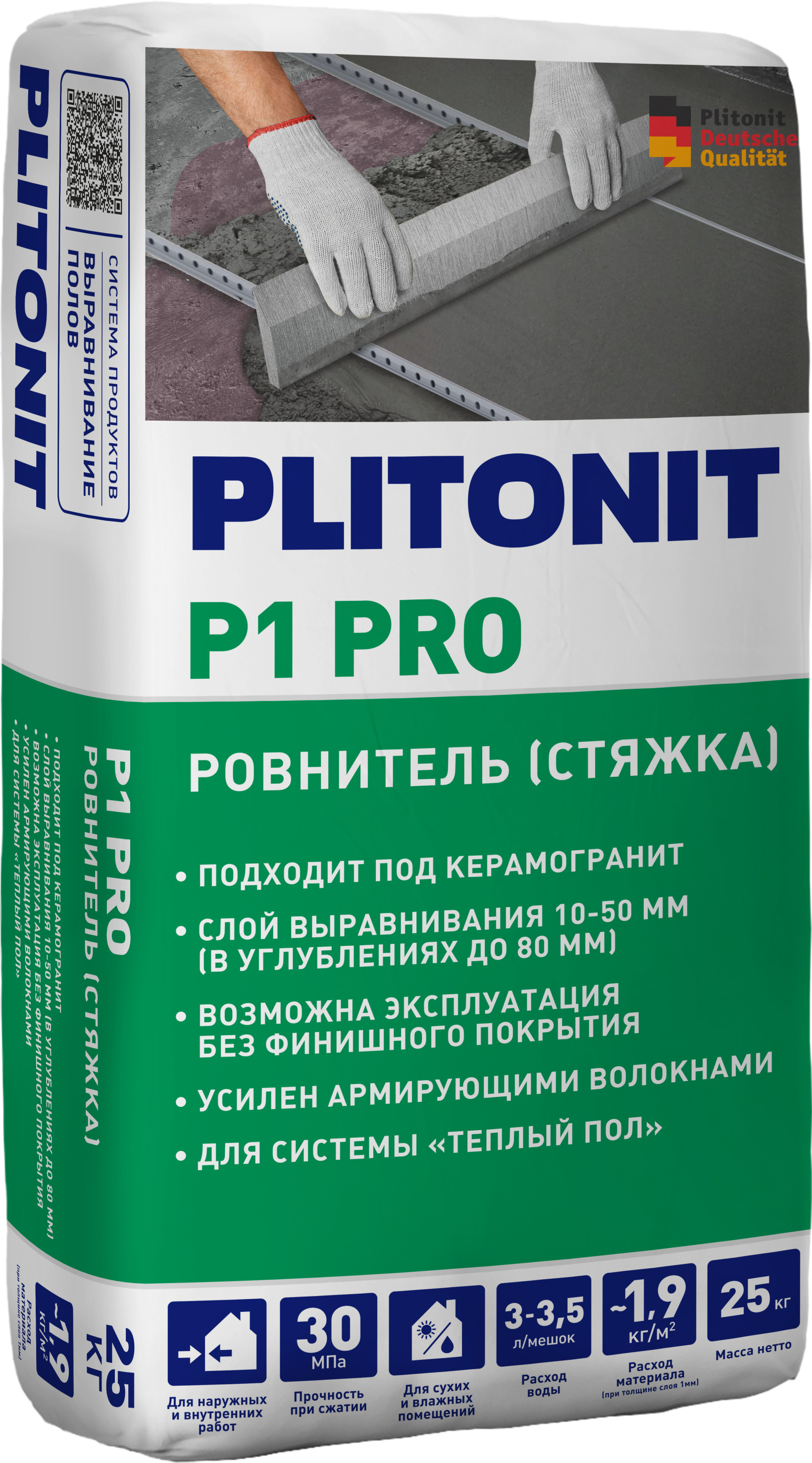 Ровнитель ПЛИТОНИТ Р1 pro для пола 10-50мм 25кг – сухая строительная смесь на цементной основе с модифицирующими добавками и армирующими волокнами, применяемая для предварительного выравнивания бетонных полов и монолитных цементных стяжек под укладку напольных покрытий. Используется для выравнивания полов под укладку напольной керамической плитки, выстилающих покрытий и паркета. Также ровнитель ПЛТИНИТ Р1 про применяется как основа для нанесения самовыравнивающихся смесей ПЛИТОНИТ, в системе «теплый пол» при проведении внутренних и наружных работ. Возможно использование выровненного основания без монтажа дополнительных напольных покрытий, допускается окраска специальными красками по бетону.