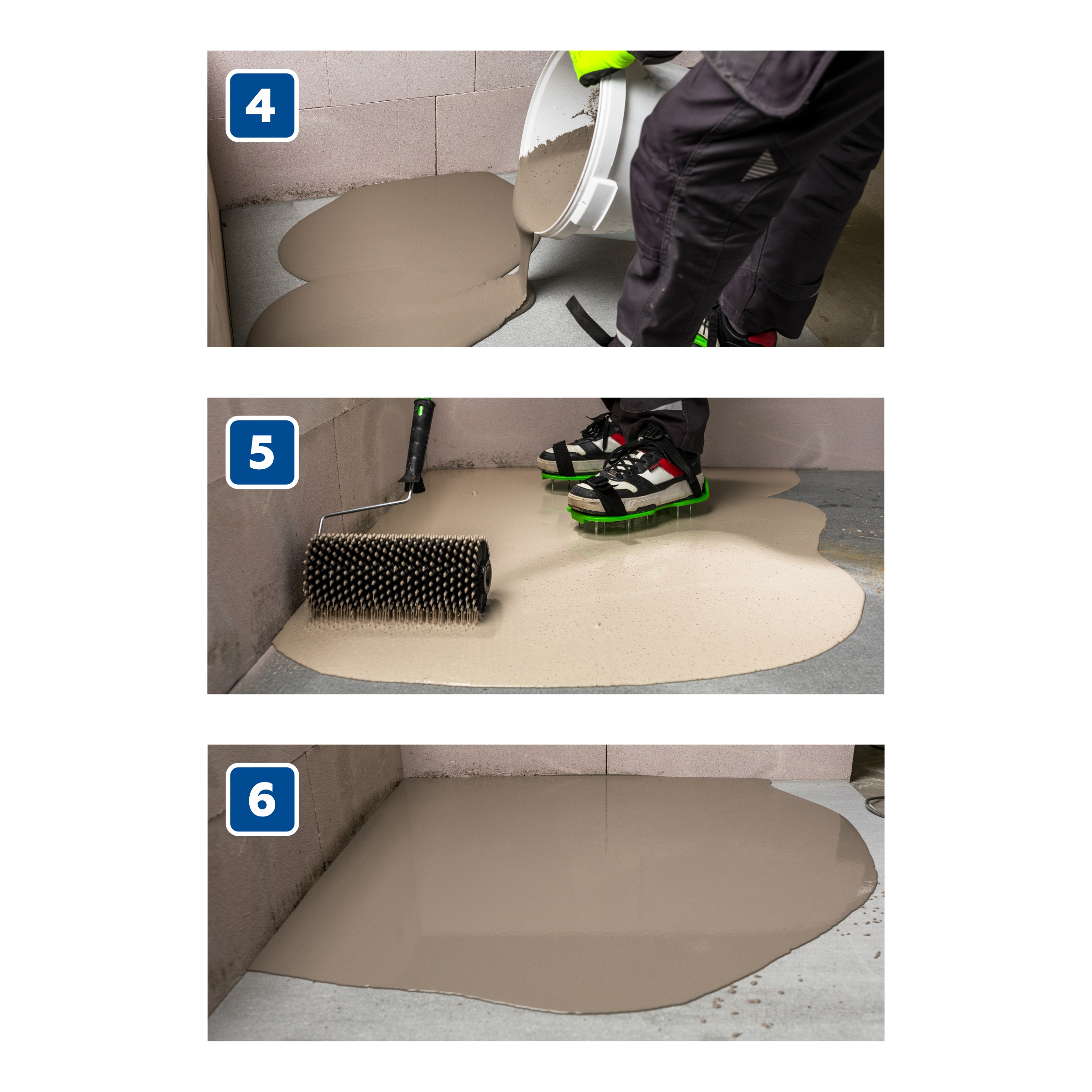 Время соединения между двумя порциями не должно превышать 10-15 минут. Для лучшего распределения выравнивающей массы по поверхности необходимо использовать широкий шпатель или игольчатый валик. Выполнение работ необходимо проводить без перерывов, соблюдая максимальный темп.