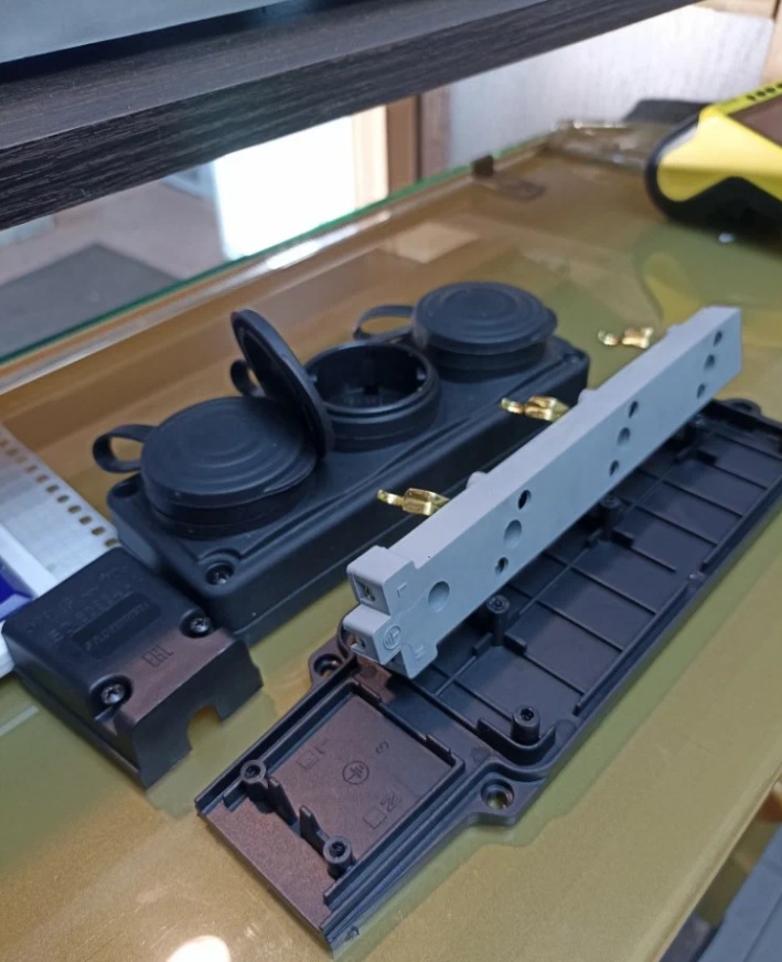 Корпус переносной розетки изготовлен из каучука, который является диэлектриком. Корпус оснащен специальной защитной крышкой, которая не допускает попадания пыли и влаги внутрь розетки. Заземляющий контакт обеспечивает дополнительную защиту от удара электрическим током.