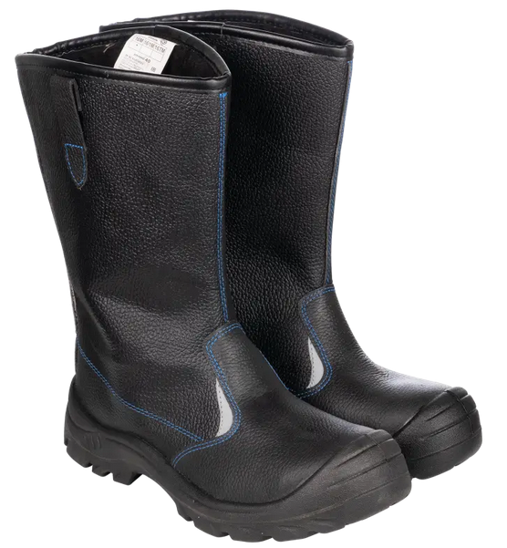Кожаные сапоги созданы для защиты ног от обычных производственных загрязнений в зимний период. В их конструкции предусмотрены боковые петли на верхней части голенища, что делает их удобными для надевания. Металлоподносок защищает ногу от ударов, при этом его максимальная нагрузка составляет 200 Дж. Однако металлоподносок обладает высокой тепло- и электропроводностью, поэтому такие сапоги не рекомендуются для использования в помещениях (производственных цехах), где могут быть очень высокие или низкие температуры, а также в местах с высоким напряжением. Светоотражающие элементы увеличивают видимость работников в темное время суток и на неосвещенной территории. Полиуретановая подошва, выполненная одним слоем и установленная методом литья, включает амортизатор в пяточной части, что позволяет снижать ударные нагрузки при ходьбе. Глубокий протектор обеспечивает хорошее сцепление с различными поверхностями и предотвращает скольжение благодаря своему рельефу. Размер - 41.