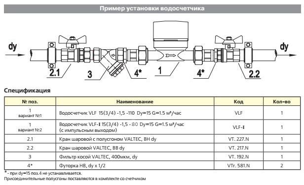 Счетчик воды универсальный 1/2' со сгонами межповерочный интервал 6 лет 110мм VLF-15U