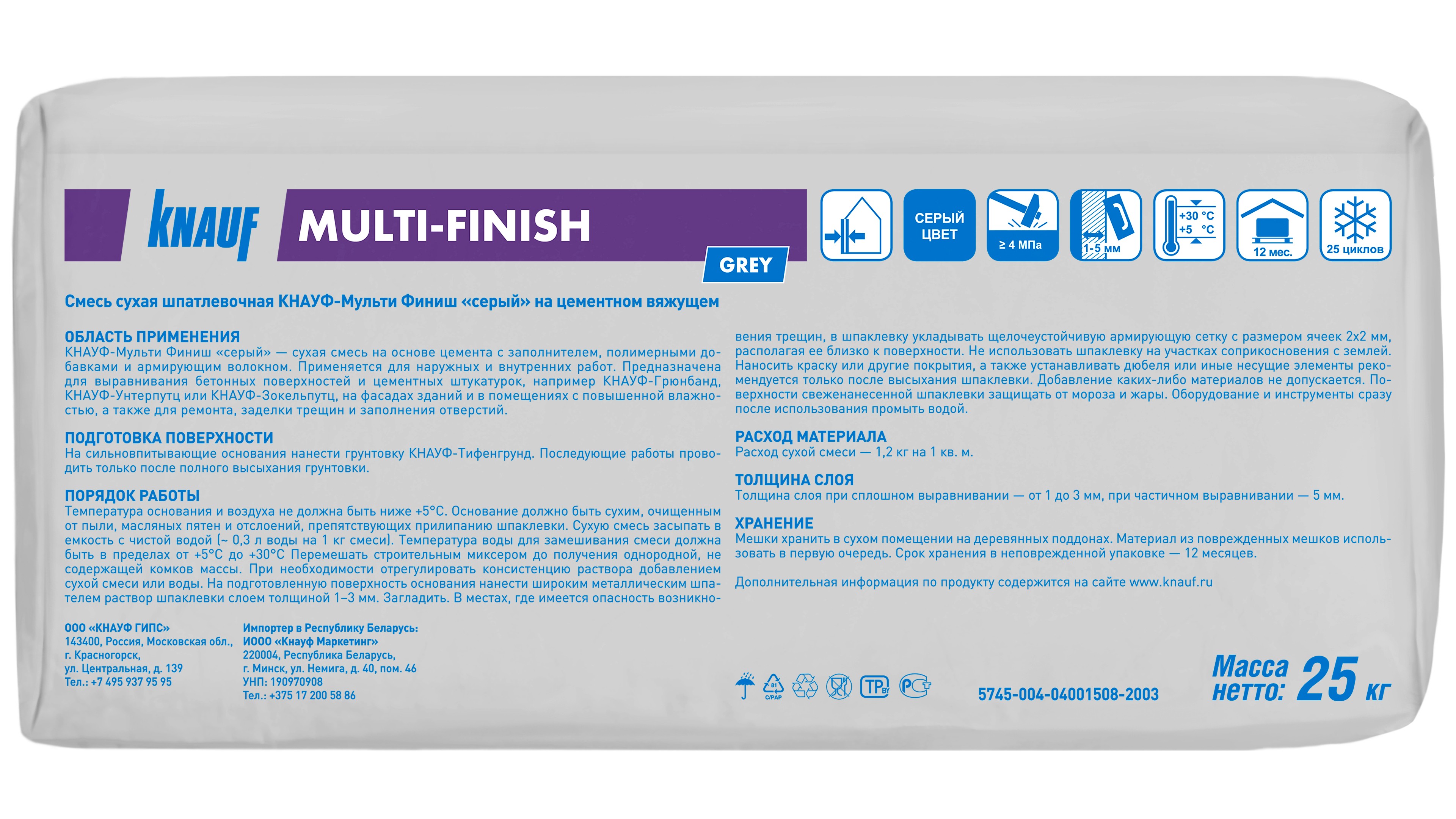 Шпаклевка КНАУФ-Мульти финиш цементная - сухая смесь на основе цемента с заполнителем и полимерными добавками. Применяется для наружных и внутренних работ. Предназначена для выравнивания поверхностей бетона и цементных штукатурок, например, КНАУФ-Грюнбанд, КНАУФ-Унтерпутц и КНАУФ-Зокельпутц. на фасадах зданий и в помещениях с повышенной влажностью, для ремонта, заделки трещин, заполнения отверстий.
