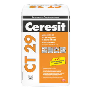 Цементная штукатурка и ремонтная шпаклевка СТ 29 – сухая строительная смесь из цемента, минеральных заполнителей и полимерных модификаторов, с добавлением армирующих микроволокон. Смесь Ceresit СТ 29 предназначена для выравнивания и отштукатуривания стен при внутренних и наружных работах ручным и машинным способом. Среди рекомендованных оснований для обработки смесью Ceresit CT 29 : цементно-песчаные, бетонные и кирпичные. Допускается использование Церезит CT 29 для тонкослойного выравнивания поверхностей, заполнения выбоин, трещин и убылей.