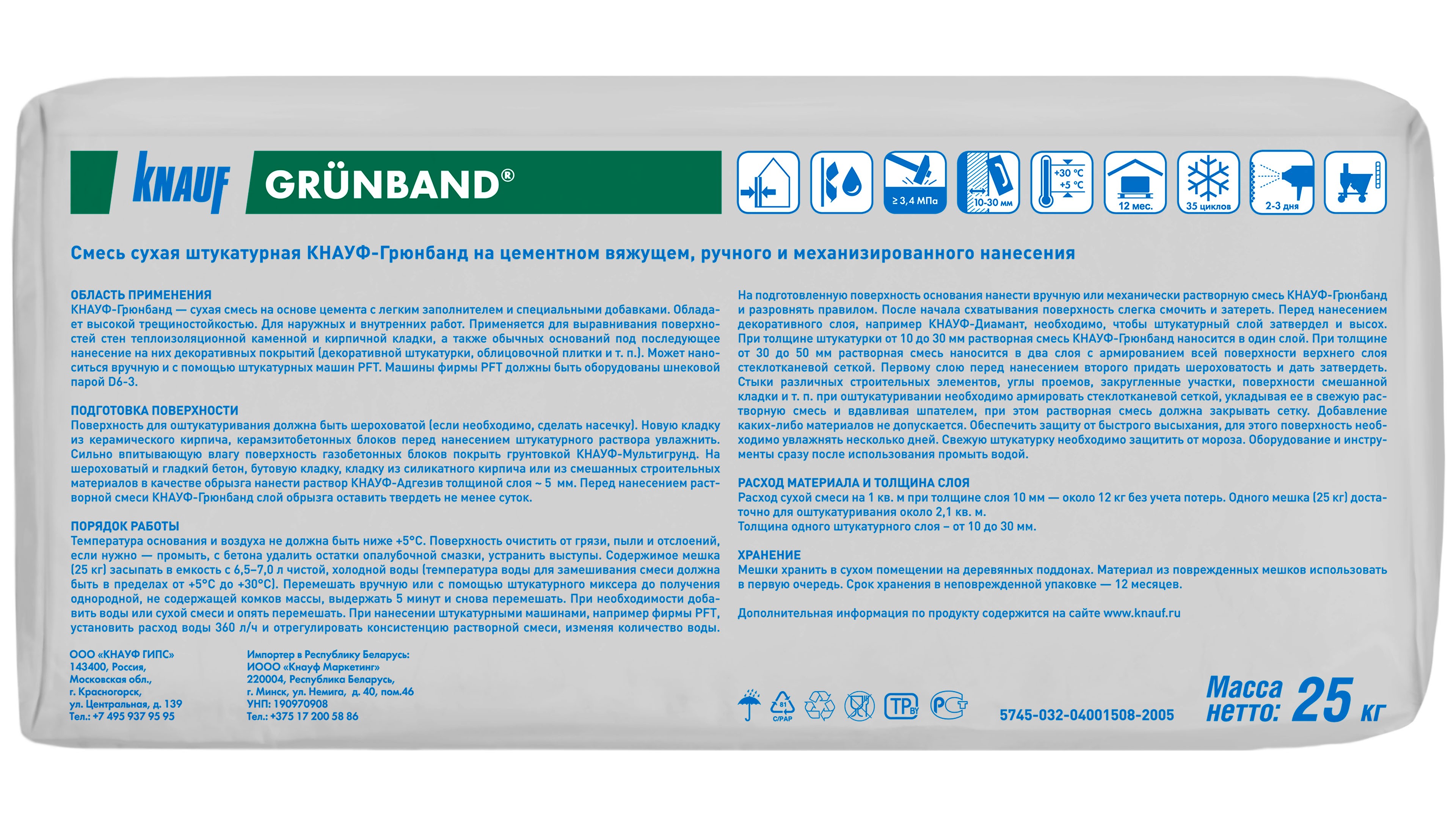 КНАУФ Грюнбанд – сухая строительная смесь на цементной основе, с добавлением специальных добавок, используемая для оштукатуривания фасадов, стен и потолков при внутренних и наружных работах ручным и машинным способом. КНАУФ-Грюнбанд наносится на стены с теплоизоляционной каменной и кирпичной кладкой (газо- и пенобетонные основания). Также Грюнбанд используется для предварительной обработки обычных оснований (керамический и силикатный кирпич, бетон и т.п.) под последующее нанесение декоративных покрытий (декоративной штукатурки КНАУФ-Диамант, облицовочной плитки).
