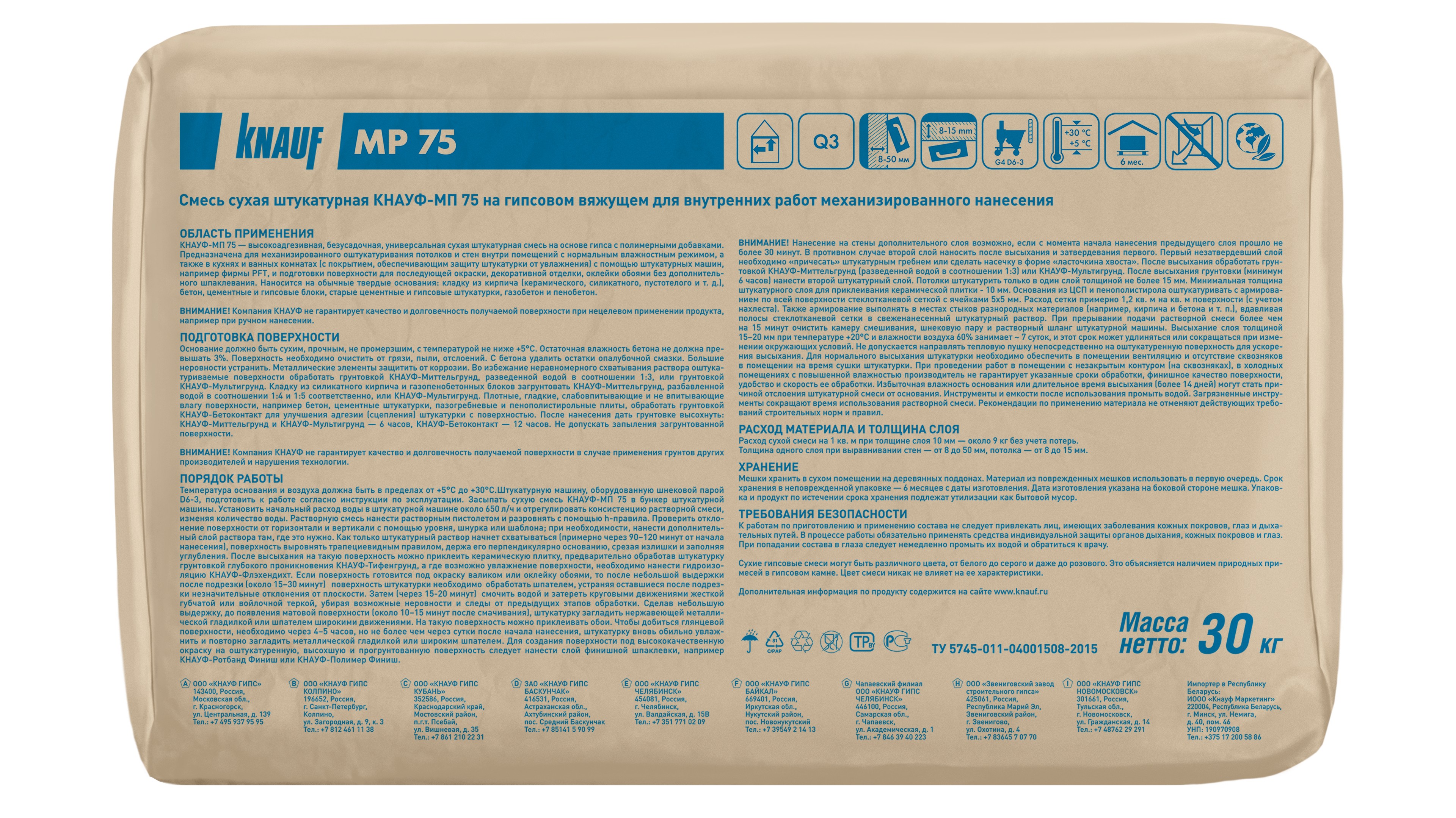 Упаковка: смесь КНАУФ-МП-75 фасуется в бумажные мешки по 30 кг.