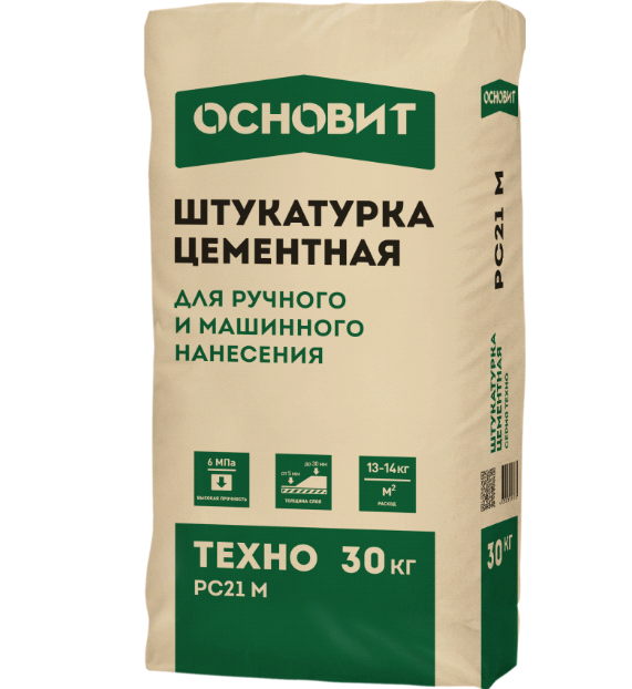 Штукатурка Основит ТЕХНО PC21 M цементная фасадная - фасадная штукатурка, предназначена для выравнивания стен из бетона, кирпича, пено- и газобетона. Рекомендуется для отделки фасадов выше цокольной части и помещений с любой степенью влажности. Для механизированного нанесения. Для внутренних и наружных работ.