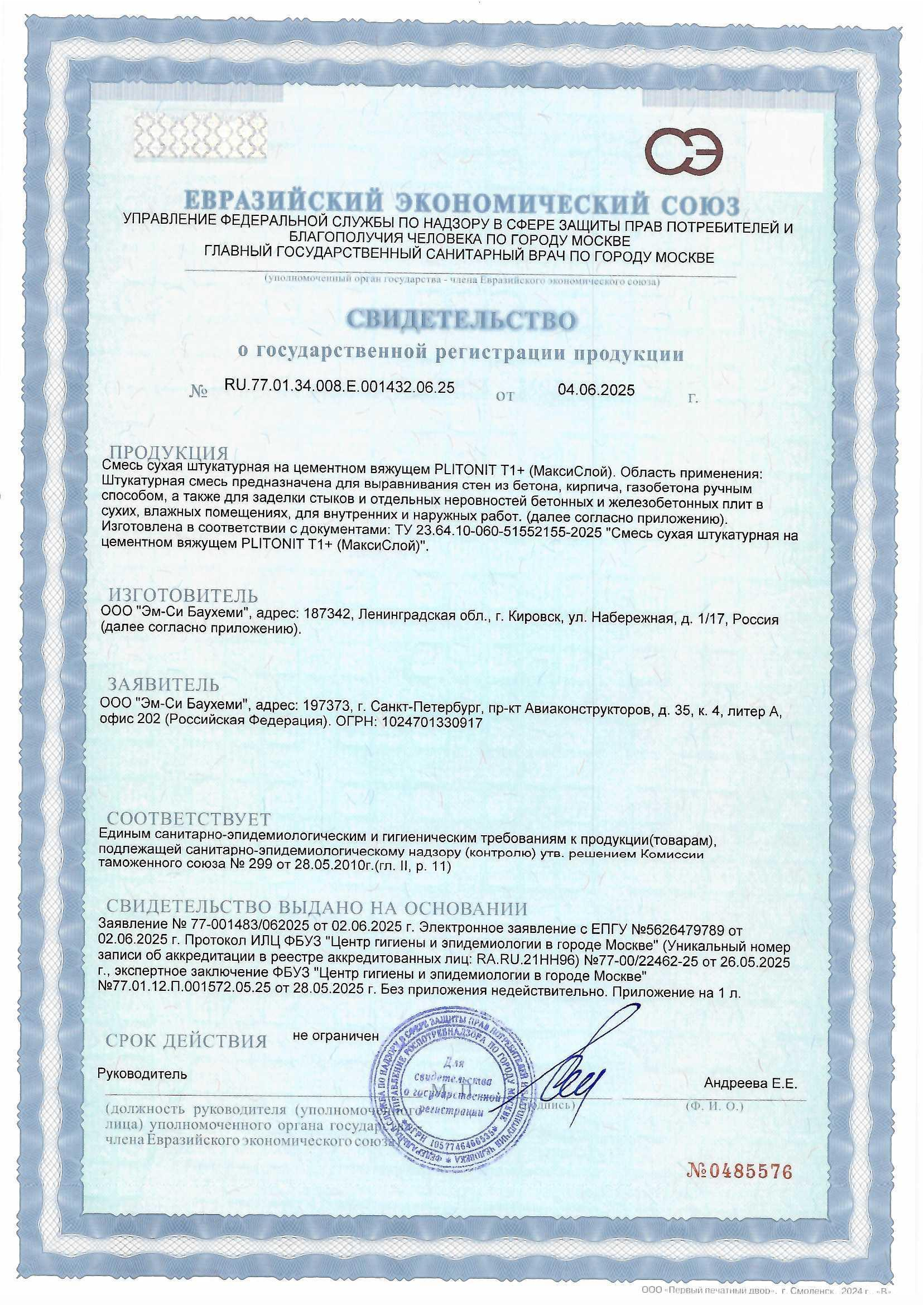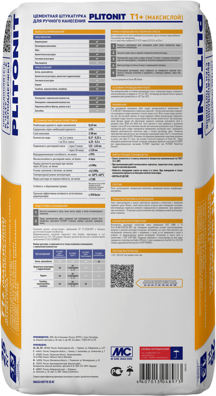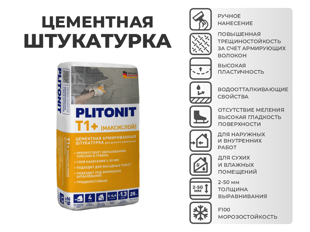 Плитонит Т1+ (Максислой) - сухая строительная смесь на основе цементного вяжущего с армирующими волокнами, предназначенная для выравнивания стен и заделки стыков и отдельных неровностей во влажных помещениях и при наружных работах. Используется по основаниям из бетона, кирпича, газобетона. Для корректировки неровностей применяется к бетонным и железобетонным плитам. Штукатурка обладает повышенными водоотталкивающими свойствами.