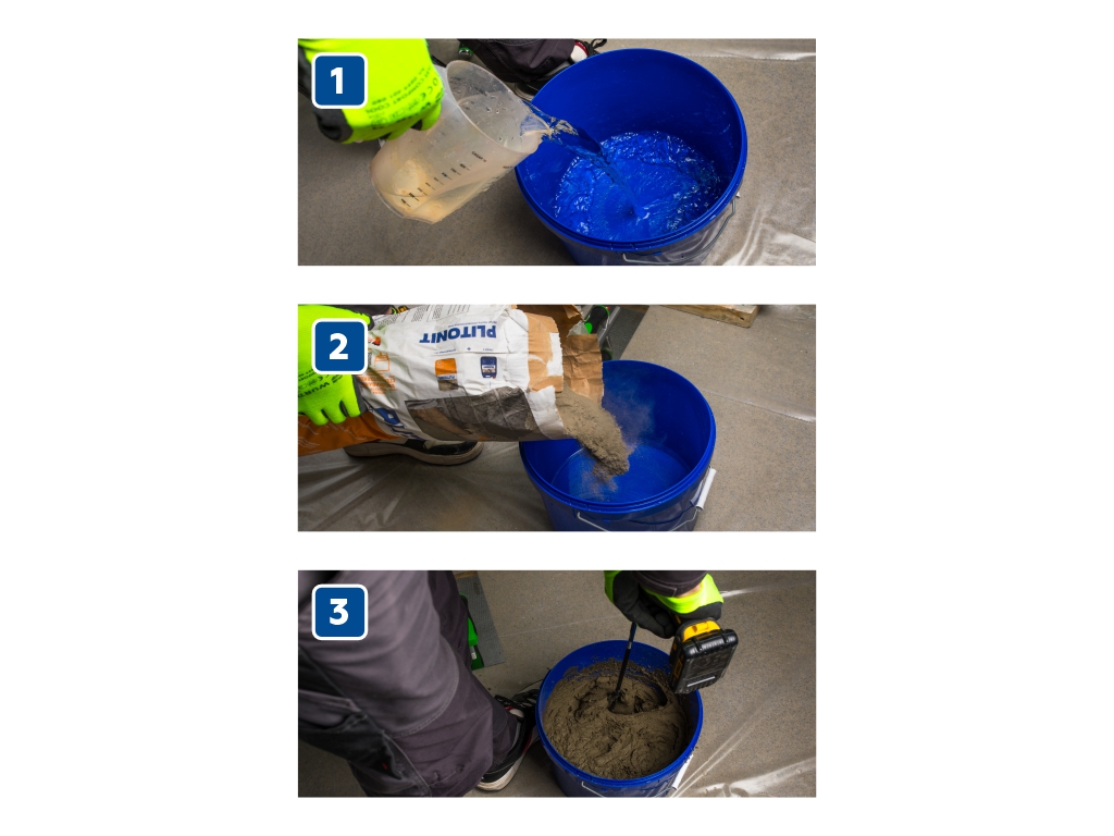 - Засыпьте сухую смесь в ёмкость с водой и перемешивайте 2-3 минуты с помощью растворосмесителся, электромиксера или электродрели с насадкой, соблюдайте частоту вращения не более 600 об/мин – до получения однородной консистенции