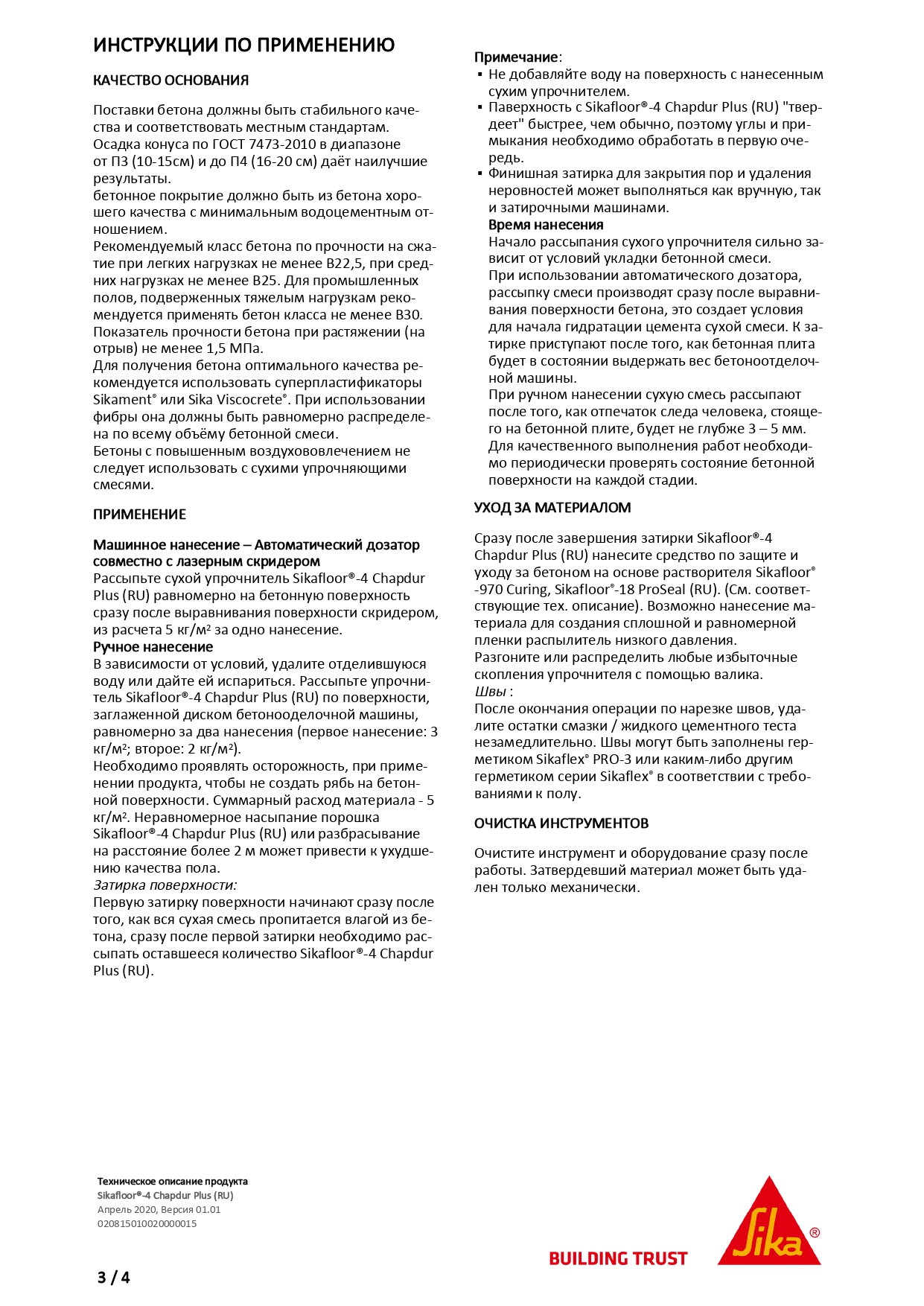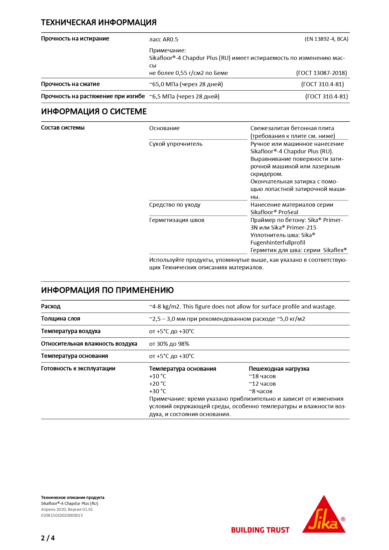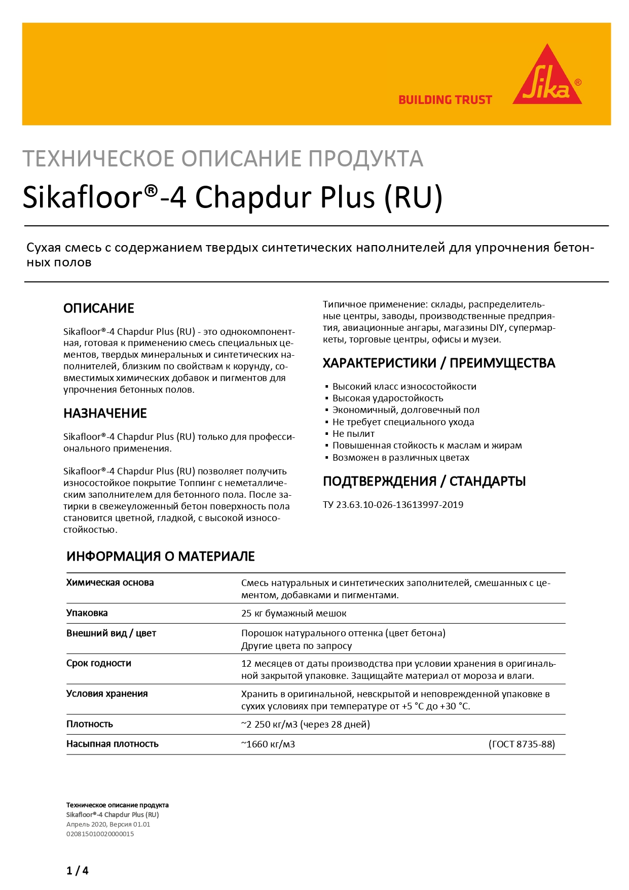 Sikafloor-4 Chapdur Plus - это однокомпонентная, готовая к применению смесь специальных цементов, твердых минеральных и синтетических наполнителей, близким по свойствам к корунду, совместимых химических добавок и пигментов для упрочнения бетонных полов.