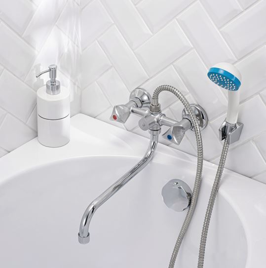 - Длина излива составляет 29,5 см, что позволяет удобно использовать смеситель для наполнения ванны и душевых процедур;