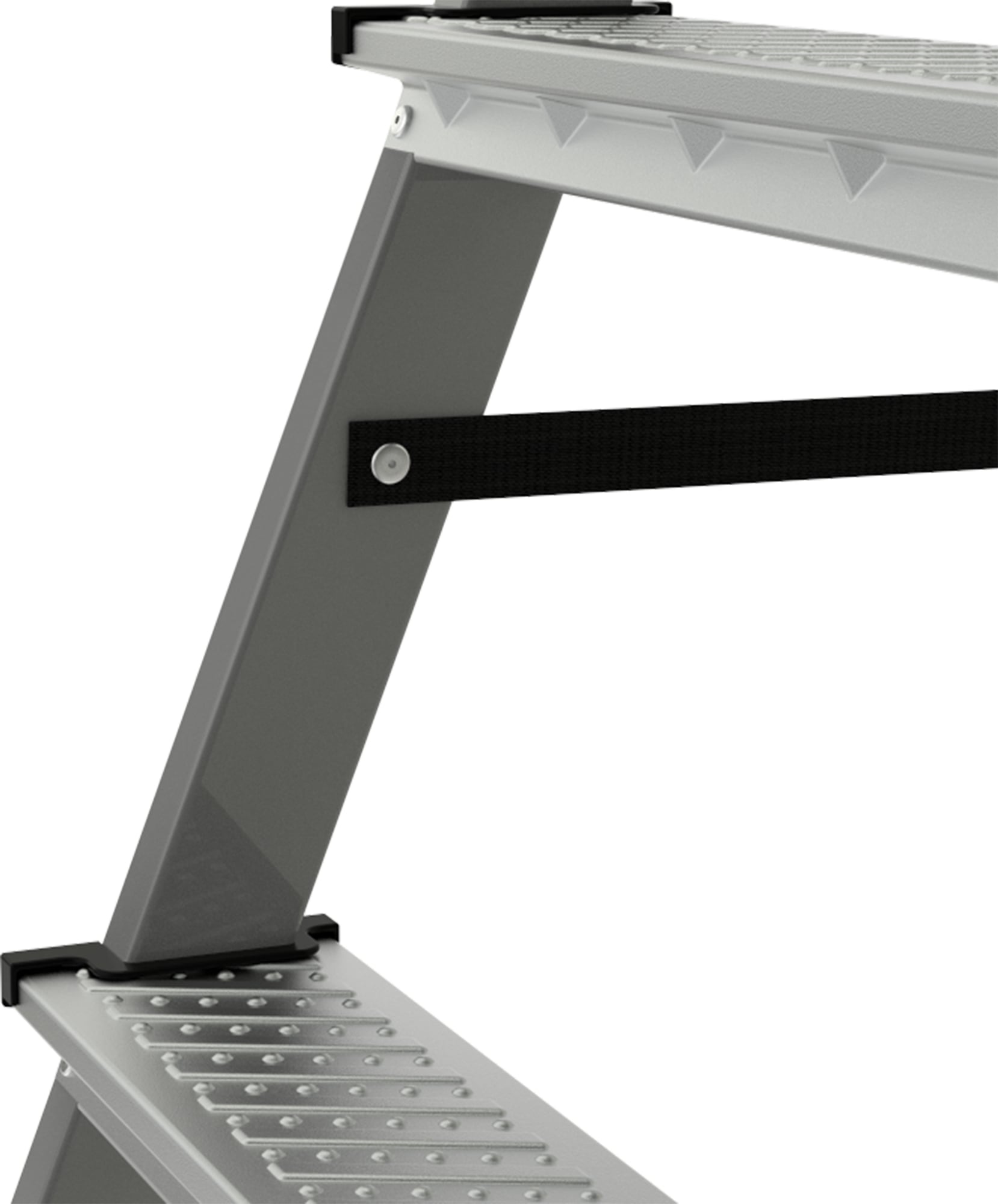 • Страховочные ремни с увеличенными шляпками заклёпок создают жёсткую и устойчивую конструкцию даже при полном комплекте из 8 ступенек.
