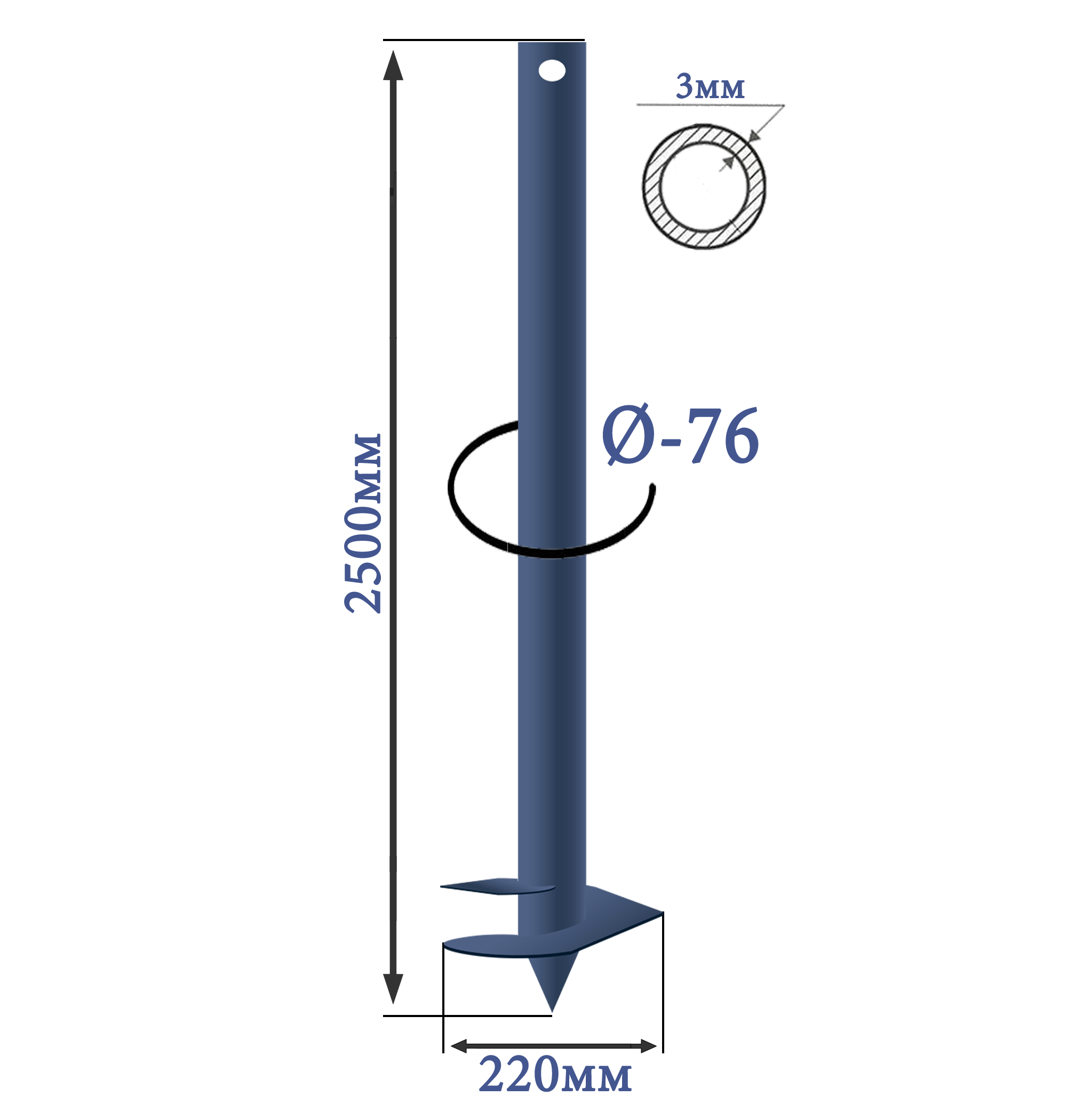 Сваи обработаны трехкомпонентным покрытием (грунт, антиржавчина и эмаль). Лопасть изготовлена из плоского листа толщиной 3мм путем резки на плазменном или лазерном станке и гибки на гидравлическом прессе. Она имеет специально рассчитанный шаг винта и приварена к свае под определенным углом.