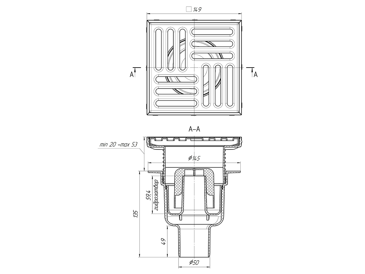 Трап АНИ 50мм, вертикальный, регулируемый, решетка металл 15 х 15см