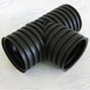 Тройник представляет собой пластиковый элемент в виде буквы "Т" со специальными фиксирующими выступами с внутренней стороны, обеспечивающими надежное соединение, либо может поставляться в гофрированном виде.